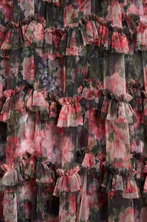 The Midnight Dance Round Neck Gown in Graphite. Beautifully printed with a floral design featuring luxurious blooms taken from archive, hand-painted artwork from the early 1900s. This style features pretty, engineered ruffle details perfectly positioned and inspired by Victorian styling. Crafted in signature Needle & Thread soft tulle for a romantic look. The skirt has a flattering fit that skims the body and gently increases in fullness, creating stunning movement within the tulle.
