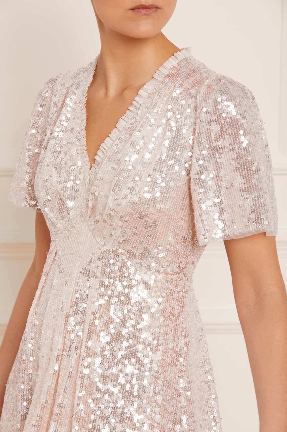 The Mila Gloss Mini Dress in Cream. This magical piece is designed with specially sourced gloss sequins creating an extra sparkle effect. Developed with perfectly placed panels and pleats to create an effortlessly, flattering silhouette inspired by a 1930's tea dress. Make a striking appearance in the Mila.
