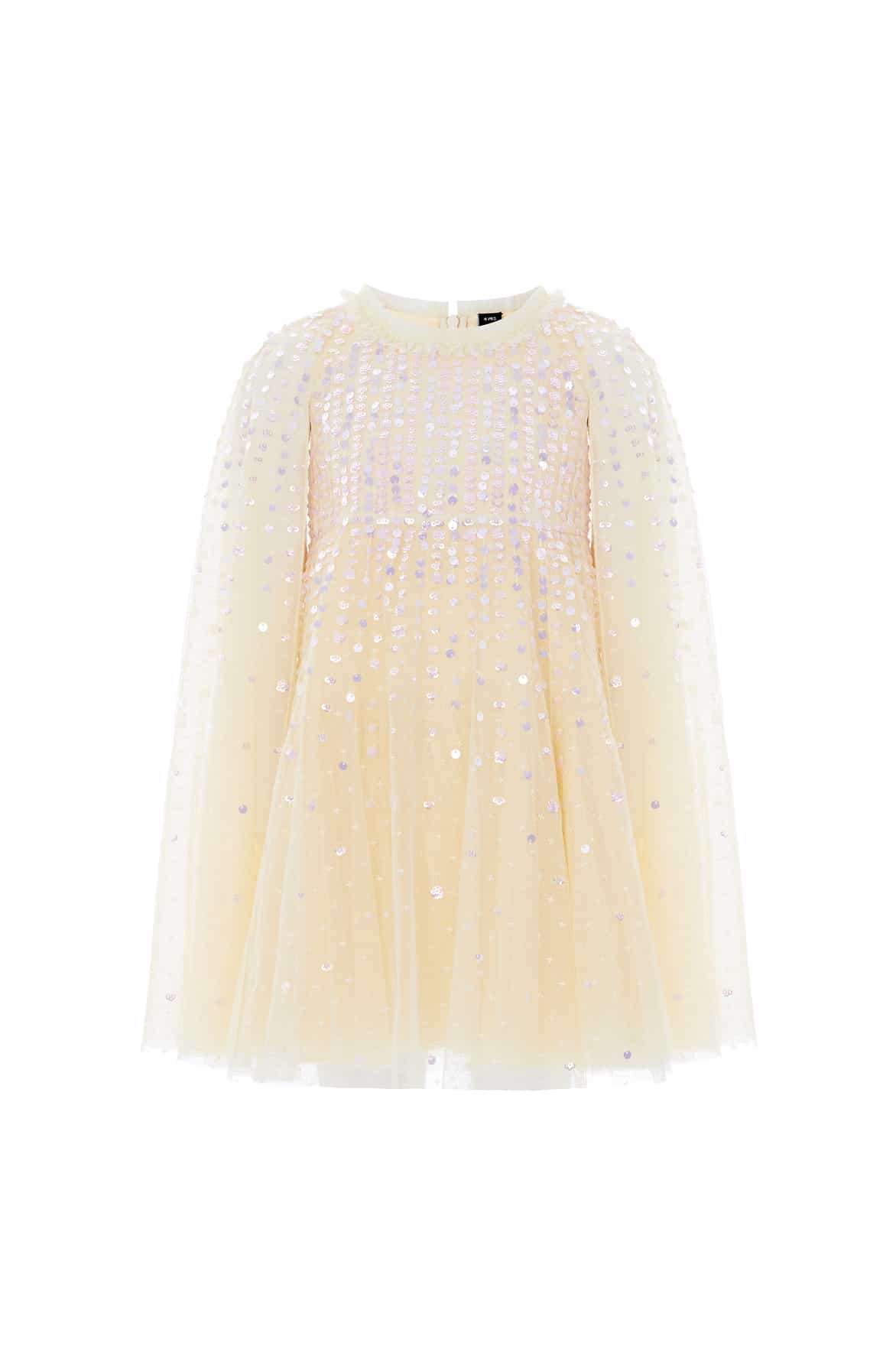 NEW SEASON. The Moonlight Sequin Cape Kids Dress in Lemon Sorbet/Pink. This enchanting kids dress is adorned with softly shimmering sequins that cascade gently across the design. The flowing cape detail and full skirt create an ethereal silhouette that moves effortlessly. Perfect for a party moment.