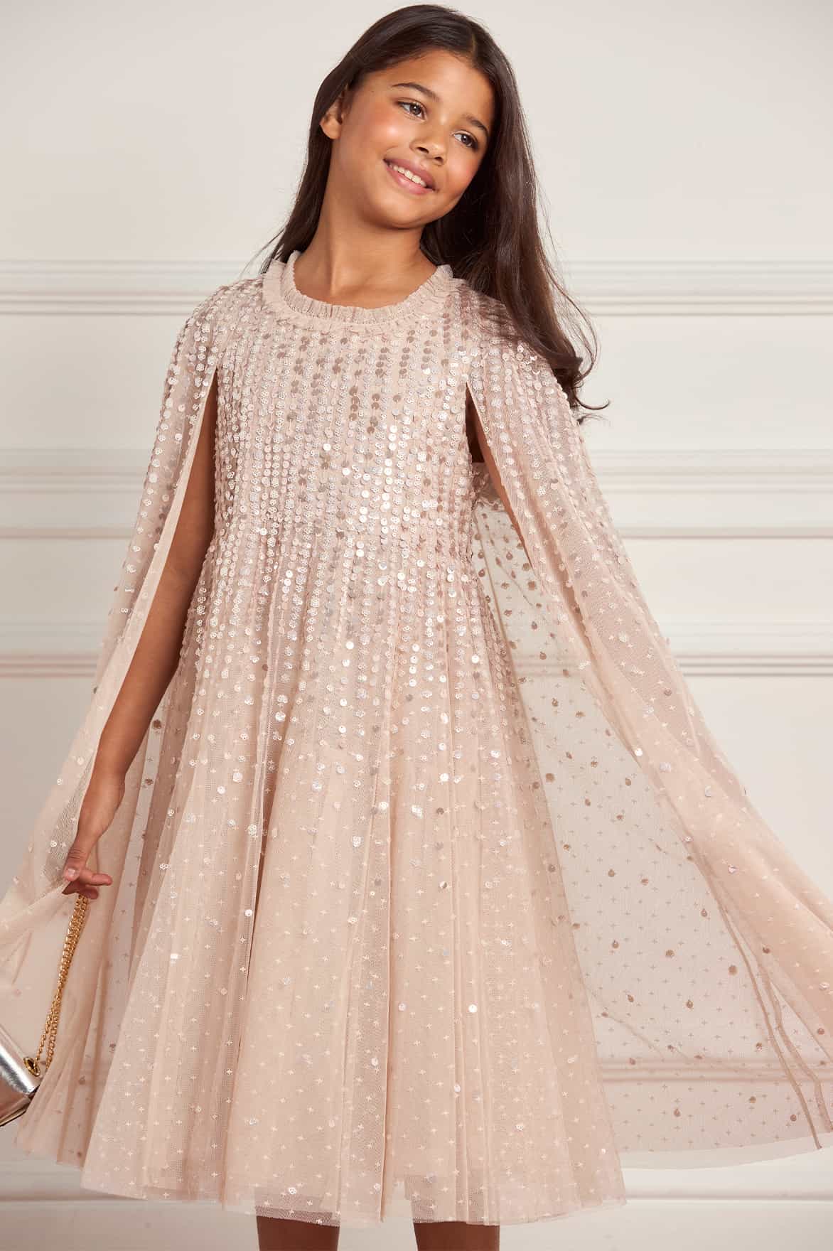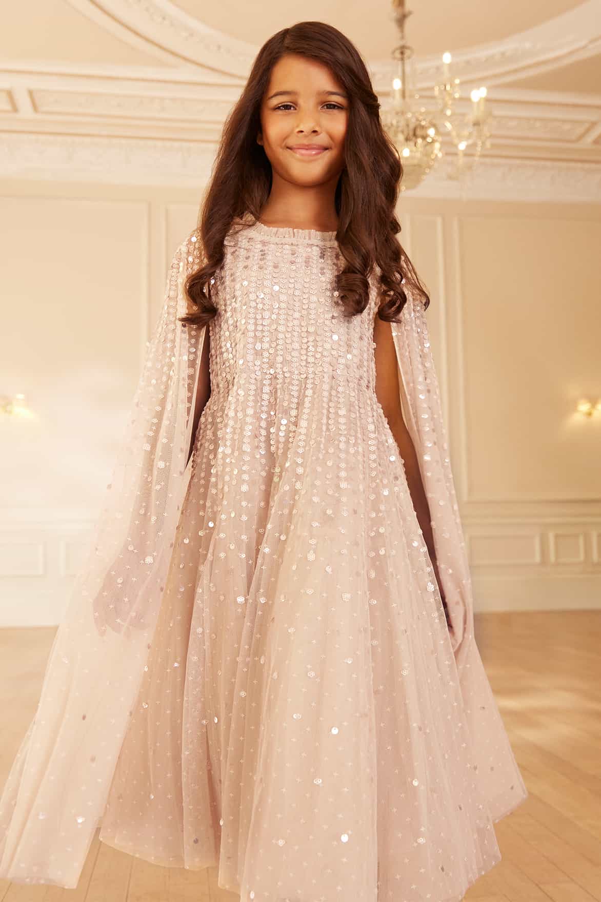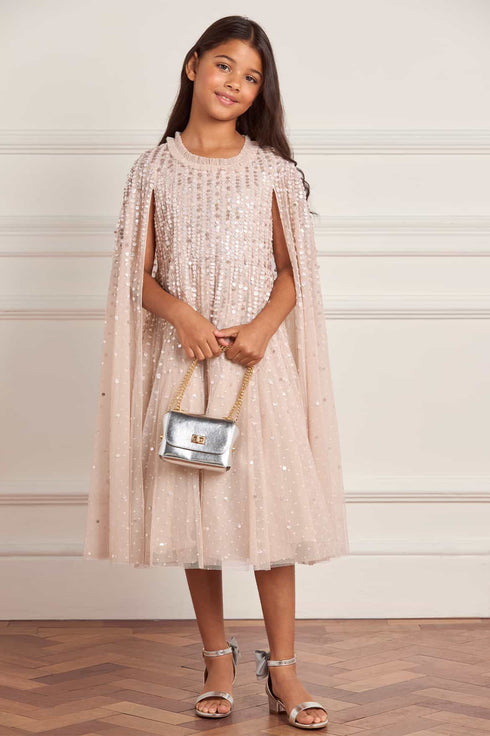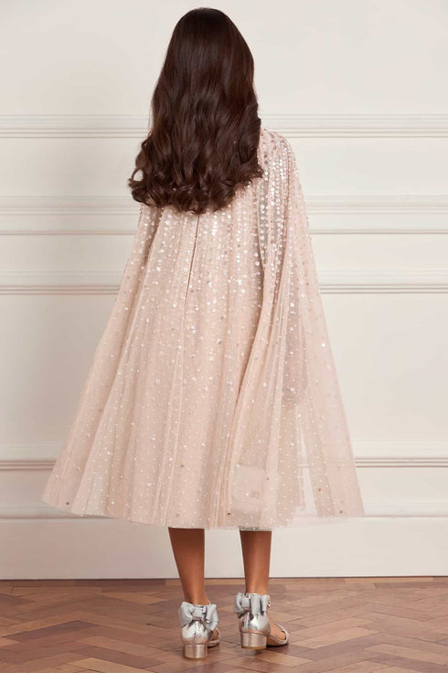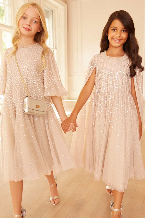 NEW SEASON. The Moonlight Sequin Cape Kids Dress in Oyster. Featuring sequins scattered across airy tulle, the dress captures the light like a starry sky. The cape sleeves flow with movement, adding an ethereal finish. In soft oyster, it is a timeless option for party season and celebrations. Match with the Moonlight Sequin Cape Sleeve Ankle Gown in Oyster from the womenswear collection for a coordinated look.