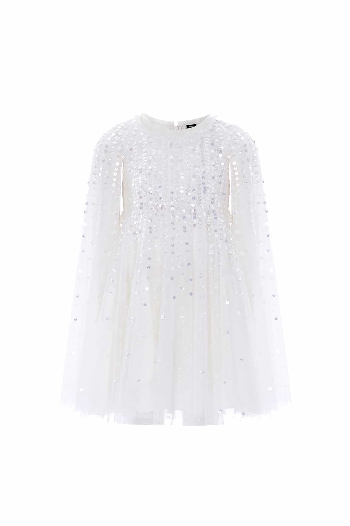 NEW SEASON. The Moonlight Sequin Cape Kids Dress in Swan White. Inspired by the shimmer of moonlit skies, this kids dress features delicate sequin detailing across a relaxed silhouette. Finished with a flowing cape detail and a softly layered skirt, it creates magical movement. A beautiful choice for a special occasion.