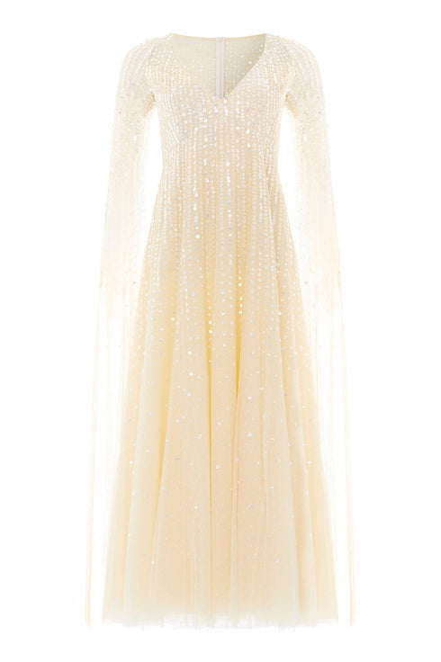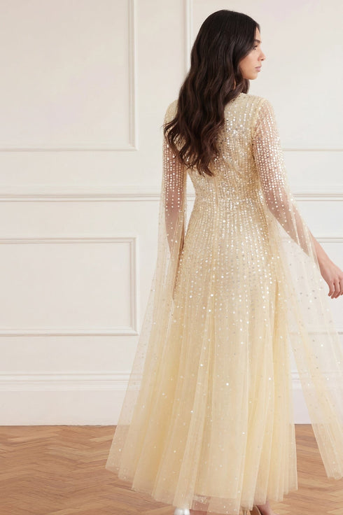 NEW SEASON. The Moonlight Sequin V-Neck Cape Sleeve Ankle Gown in Lemon Sorbet. This romantic gown features delicate sequin embellishment inspired by the glow of moonlight, with tiny dot motifs and mirrored accents. Designed with a flattering V-neckline, cape sleeves and an ankle-length silhouette for effortless elegance.