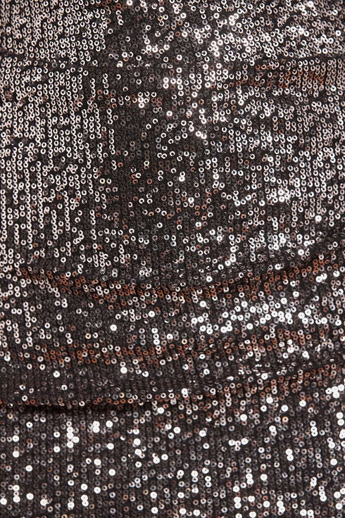 The Nova One-Shoulder Micro Mini Dress in Gunmetal. This dress is inspired by vintage Hollywood glamour. Beautifully designed with an elegant off-the-shoulder structure. Adorned all over with tiny glittering sequins for the ultimate statement. Crafted with a slim silhouette enhanced by soft drapes across the body. The perfect romantic dress for an upcoming special occasion. We hope you adore this new style as much as we do at Needle & Thread head office.