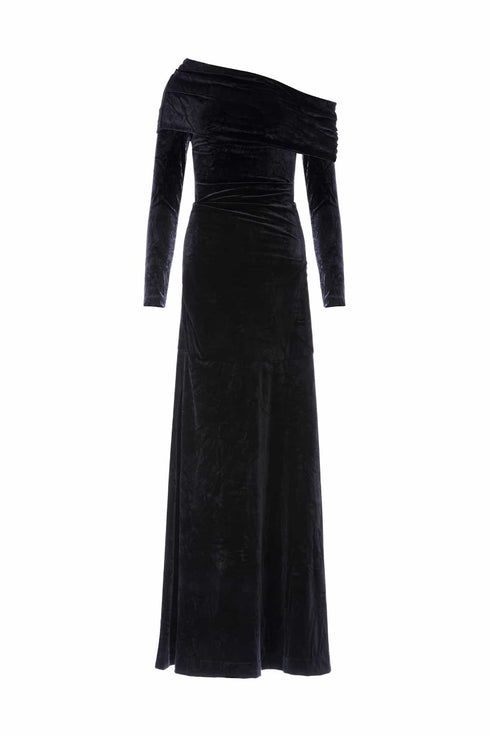 NEW SEASON. The Nova Velvet One-Shoulder Gown in Graphite. A luxurious velvet interpretation of the Bright Star theme. Crafted in a dramatic one-shoulder silhouette, this gown sculpts the figure with elegant precision. The graphite velvet evokes night-sky depth, offering a perfect balance of modern glamour and timeless romance.