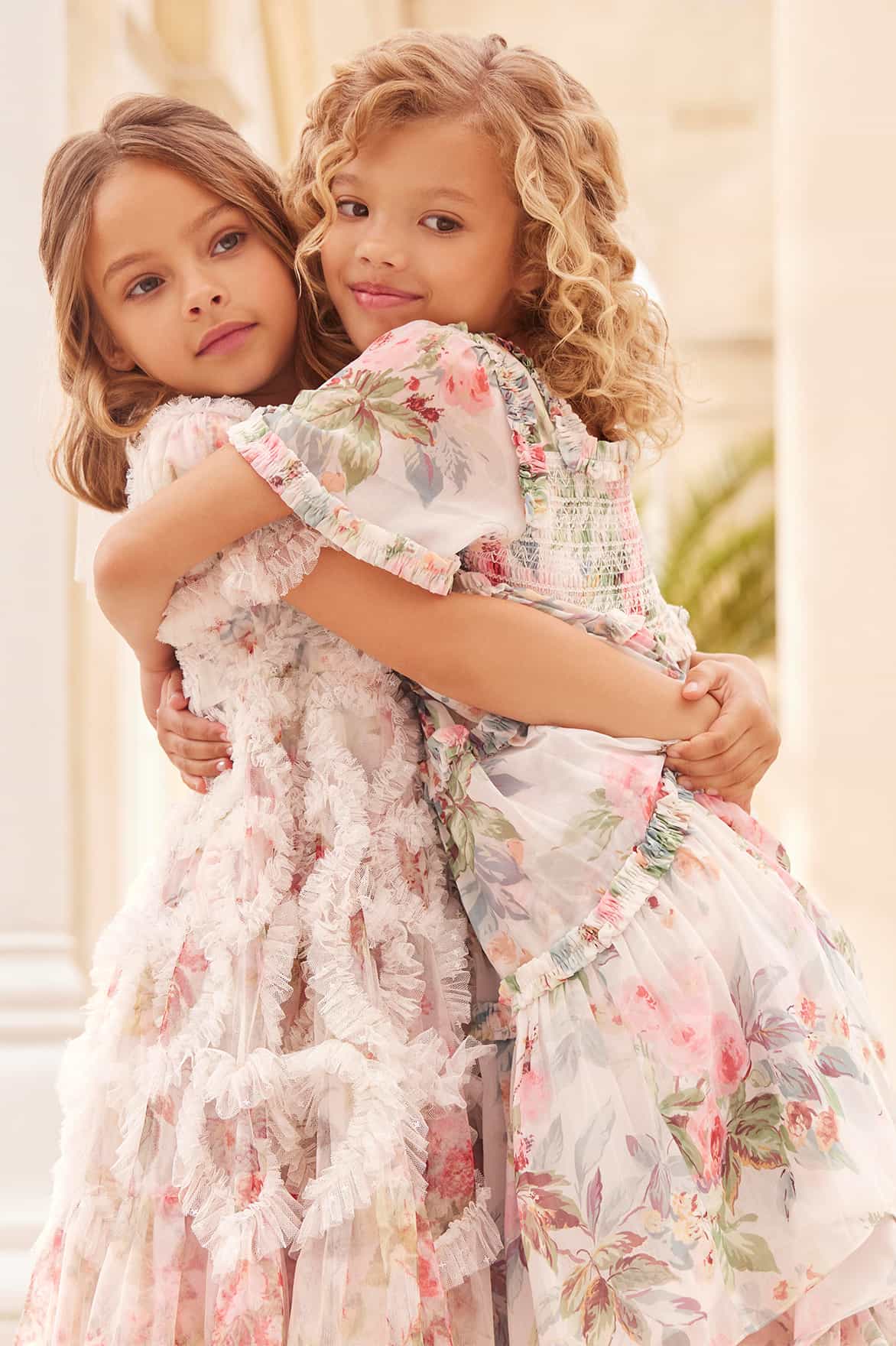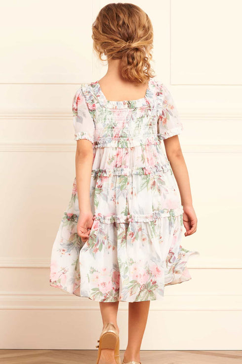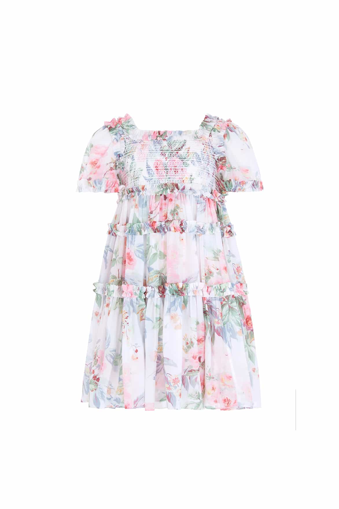 - Floral printed chiffon decorated with elastic smocking and ruffles