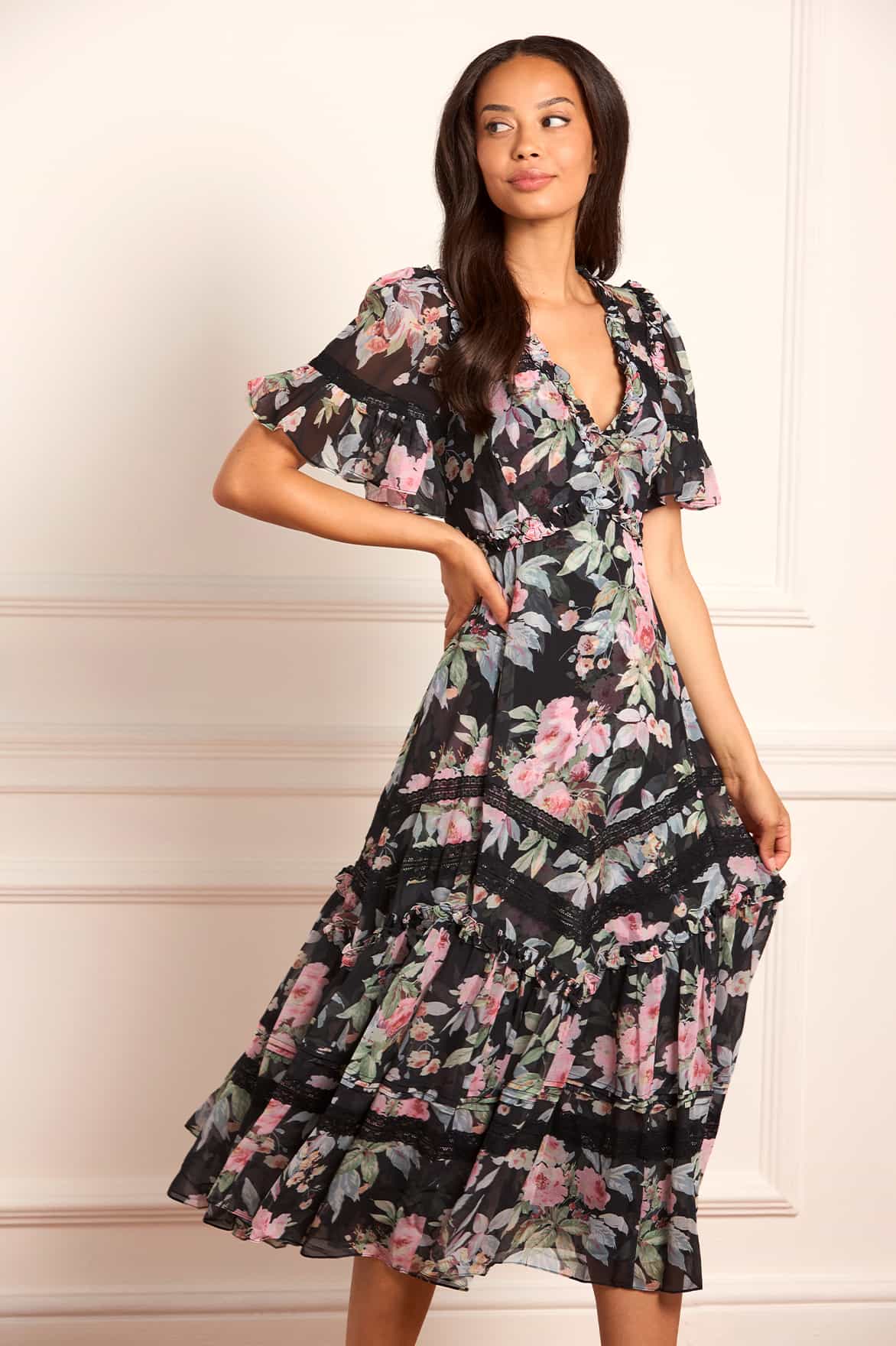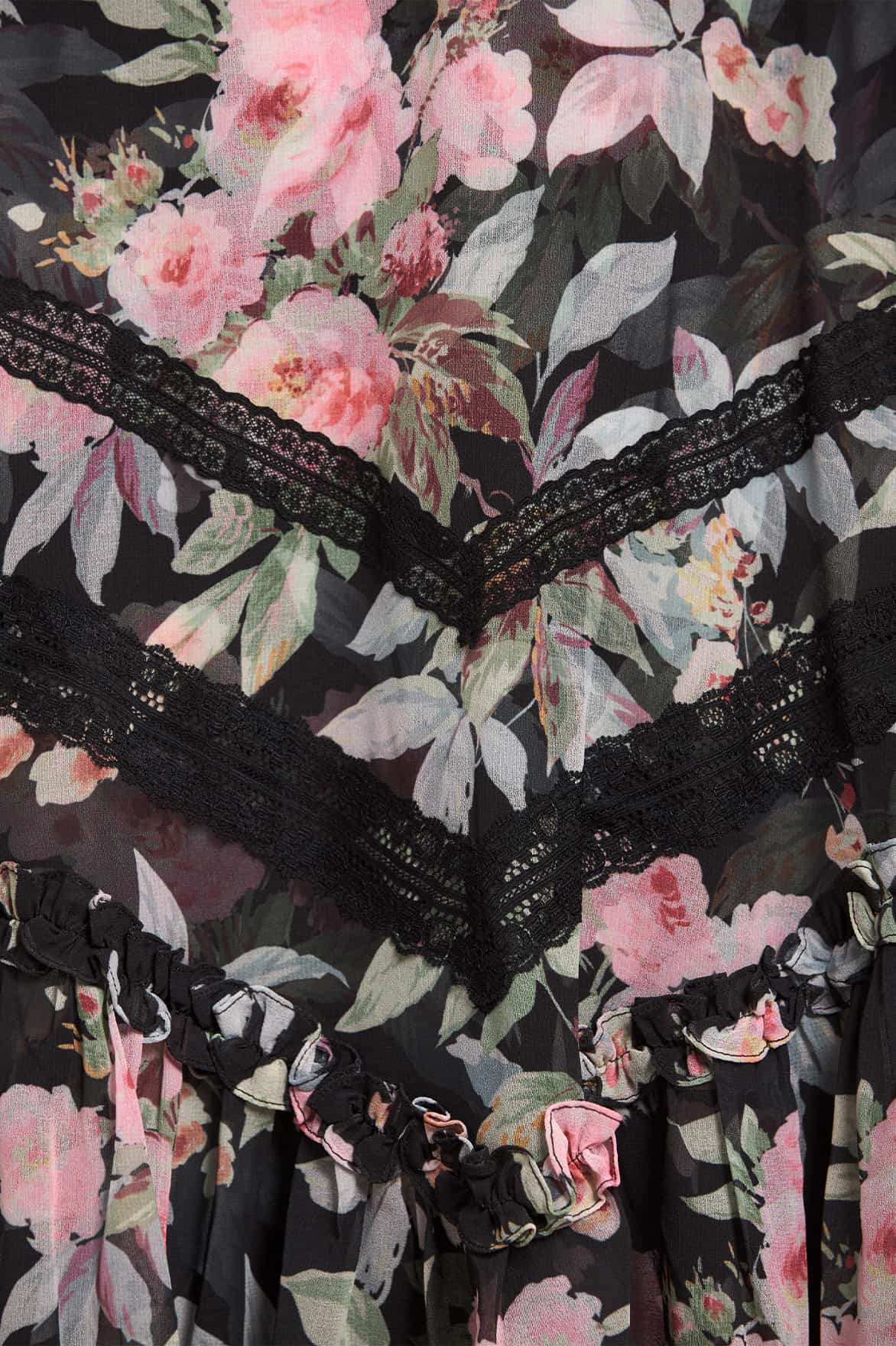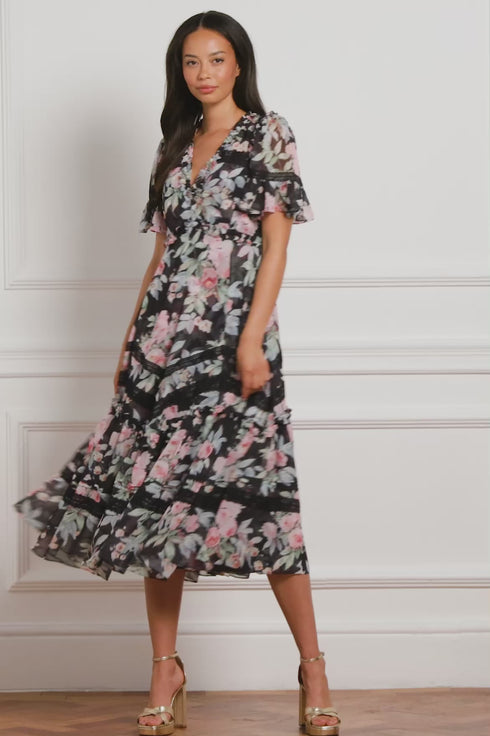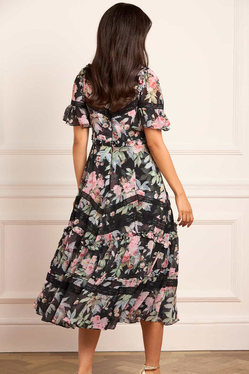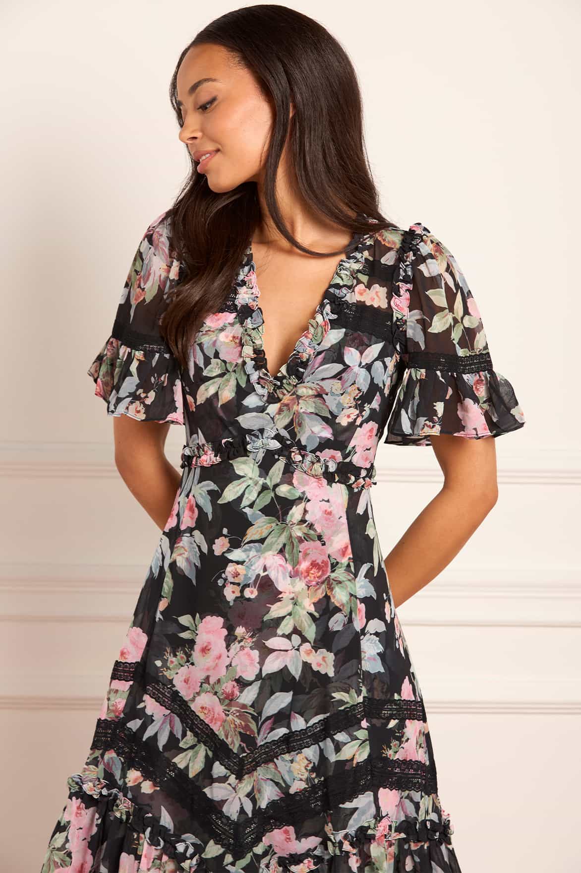 The Paradise Garden Sonata Georgette Ballerina Dress in Graphite. The print of this dress is inspired by an enchanting paradise garden print, taken from an 1900s hand-painted artwork. This dress is designed with a luxe, twilight inspired colour palette in rich, lush floral motifs to create a truly alluring print. Developed in our soft, georgette fabric creating a flowing silhouette. Designed with Victorian inspired garments featuring a lace insert detailing and panelling. A transitional day to night piece.