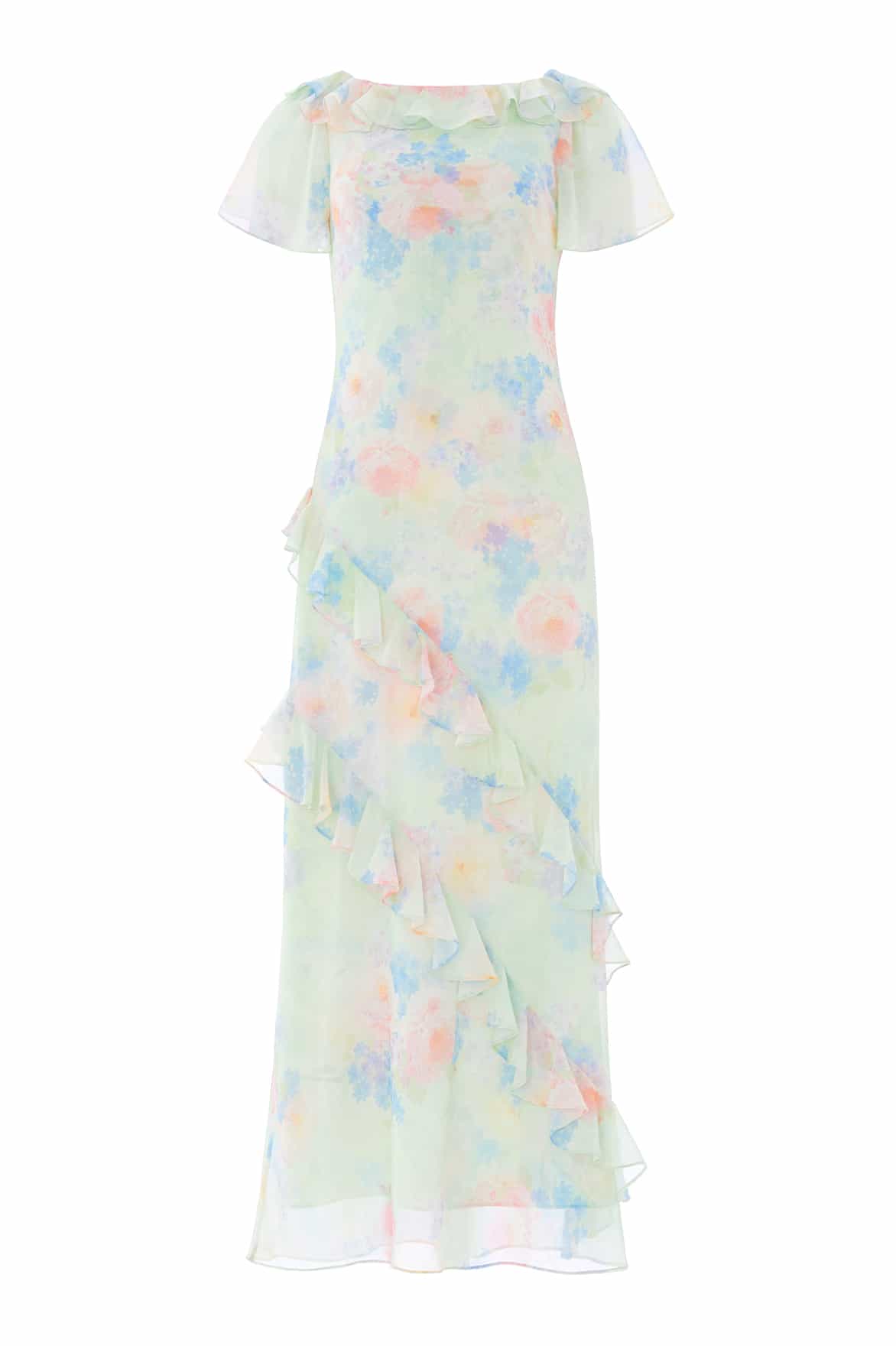 NEW SEASON | NEEDLE & THREAD EXCLUSIVE. The Peony Bloom Georgette Short Sleeve Gown in Peppermint. This romantic gown features a soft floral print inspired by historic garden artwork, with peony bouquets and trailing daisies throughout. Cut on the bias for a fluid drape that effortlessly skims the body, finished with short sleeves for graceful movement.