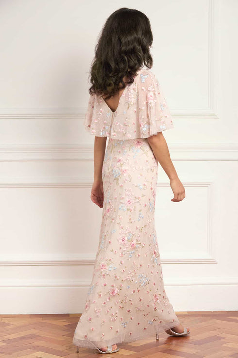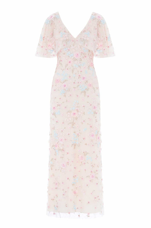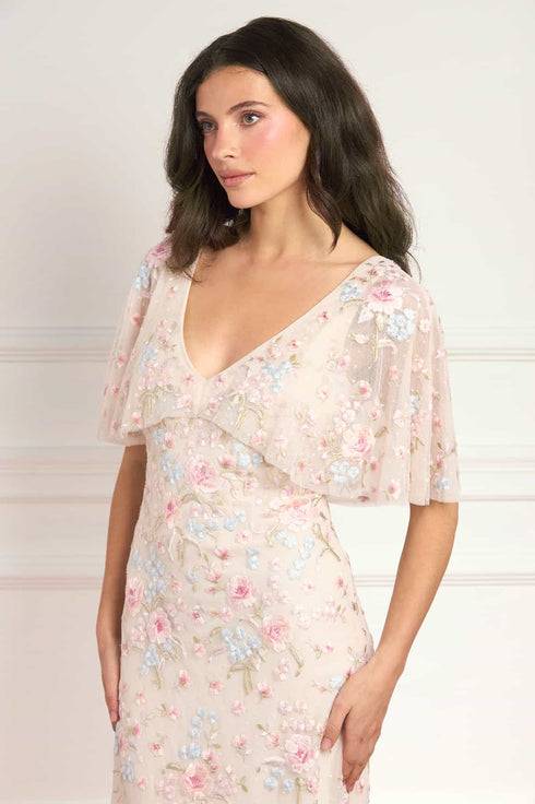 NEW SEASON. The Peony Bouquet V-Neck Cape Gown in Cream/Multi. This elegant gown features exquisite floral embroidery inspired by archival garden paintings. Designed with an integrated cape and a slim silhouette, it is complemented by a bias-cut lining for a smooth, body-skimming fit and effortless wear.