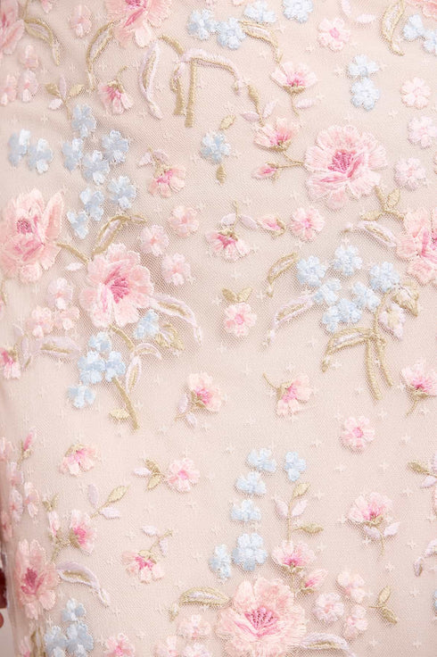 - Kisses tulle decorated with floral embroidery.