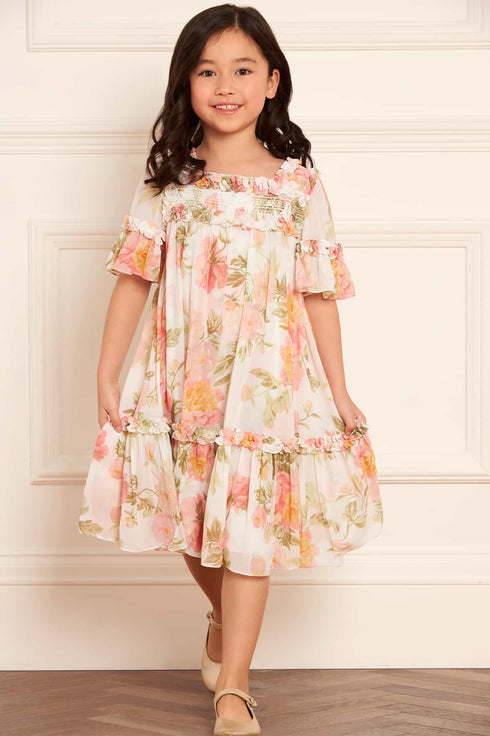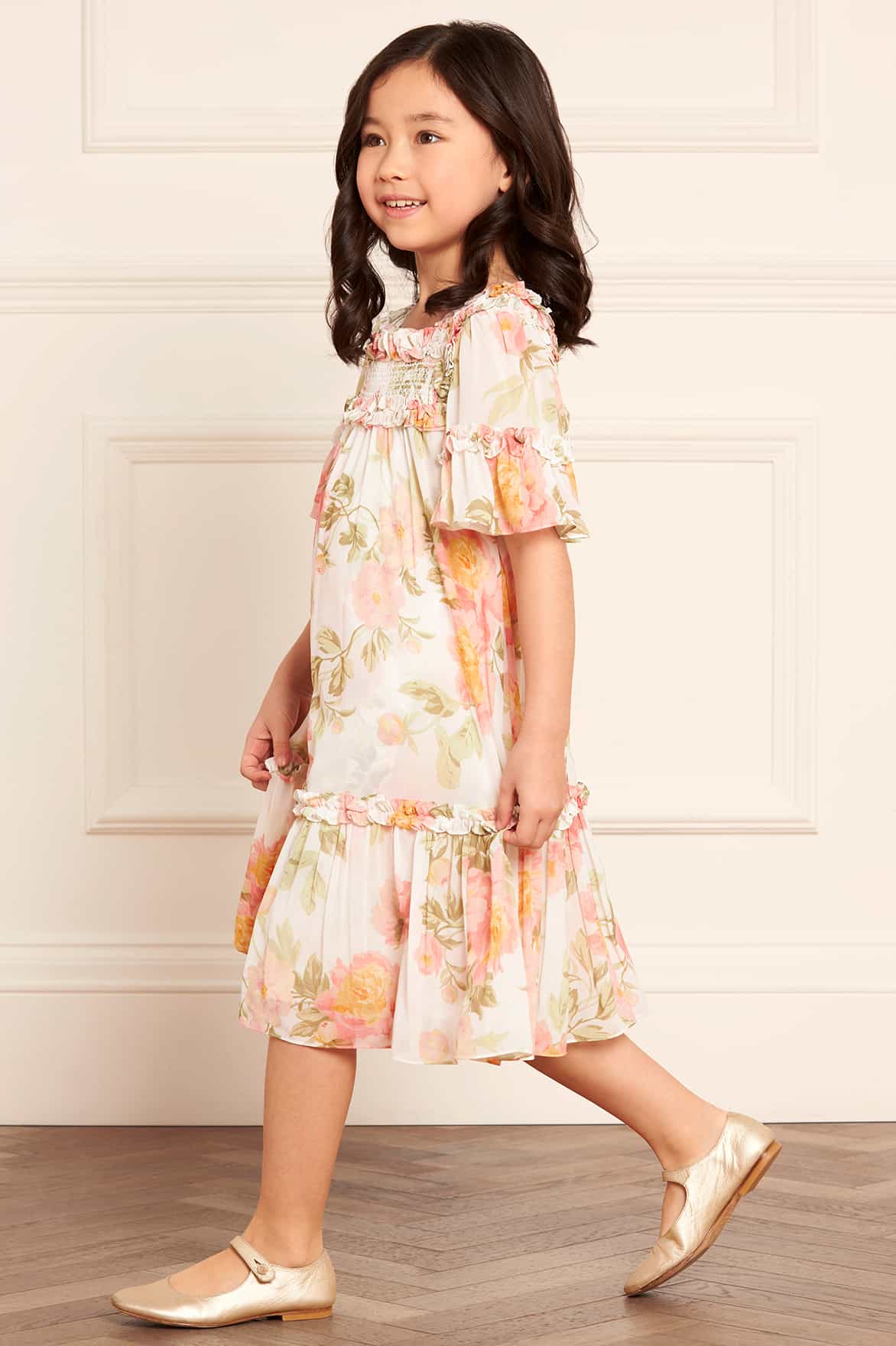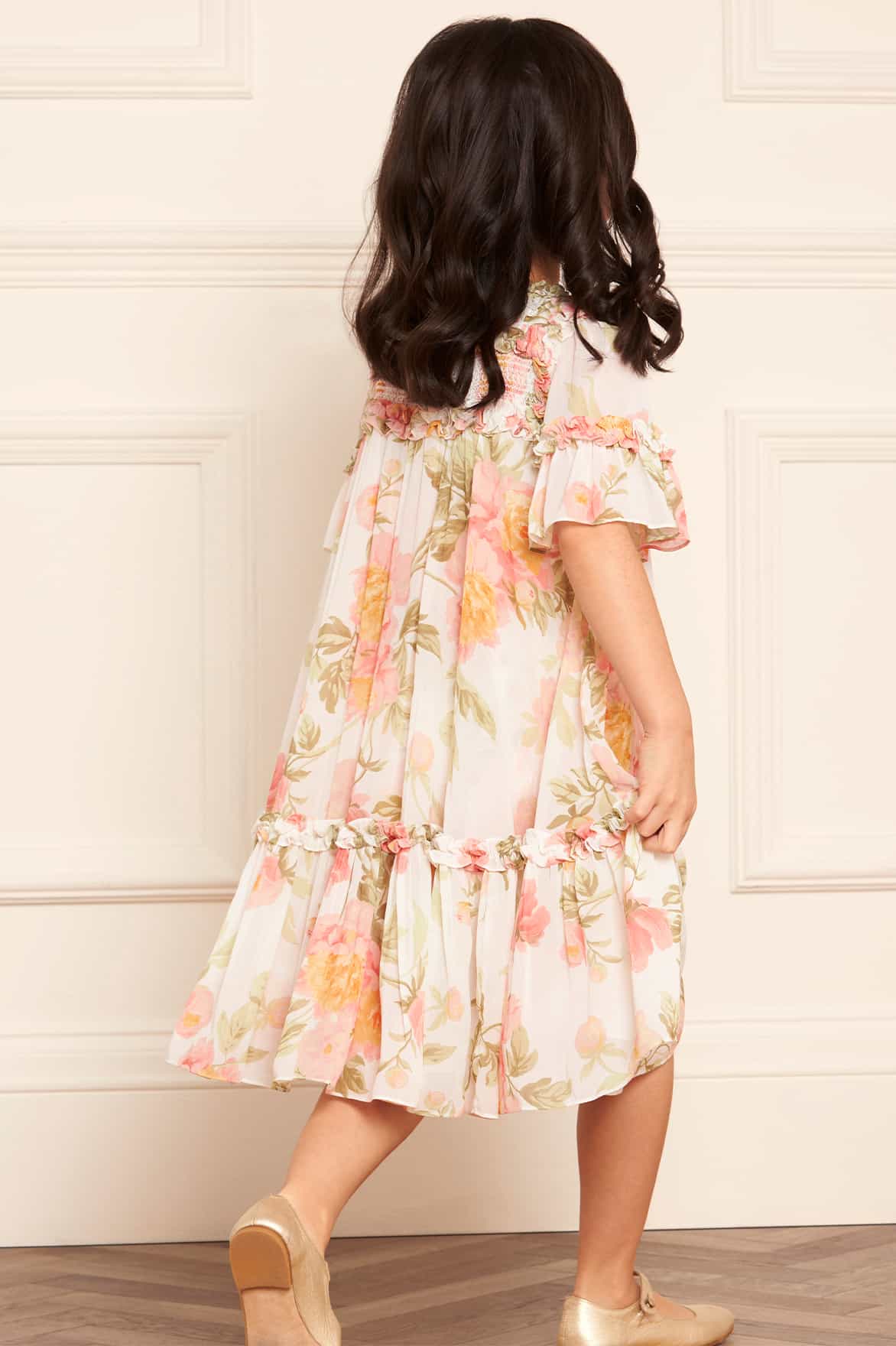 Peony Promise Chiffon Bella Kids Dress in Moonshine. This beautiful archive print features hand-painted sunset pink peonies in full bloom. Developed on a soft chiffon fabric featuring voluminous ruffles perfect for twirling. This dress is adorned with delicate frills for Needle & Thread signature styling. This pretty dress is perfect for picnic parties, birthdays and warmer weather getaways.