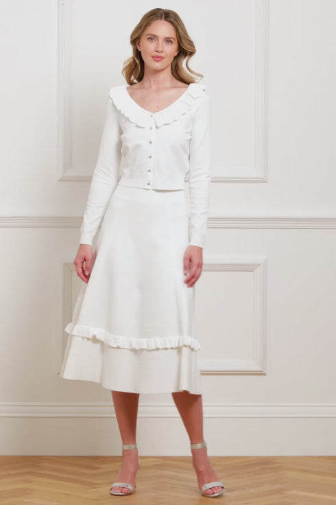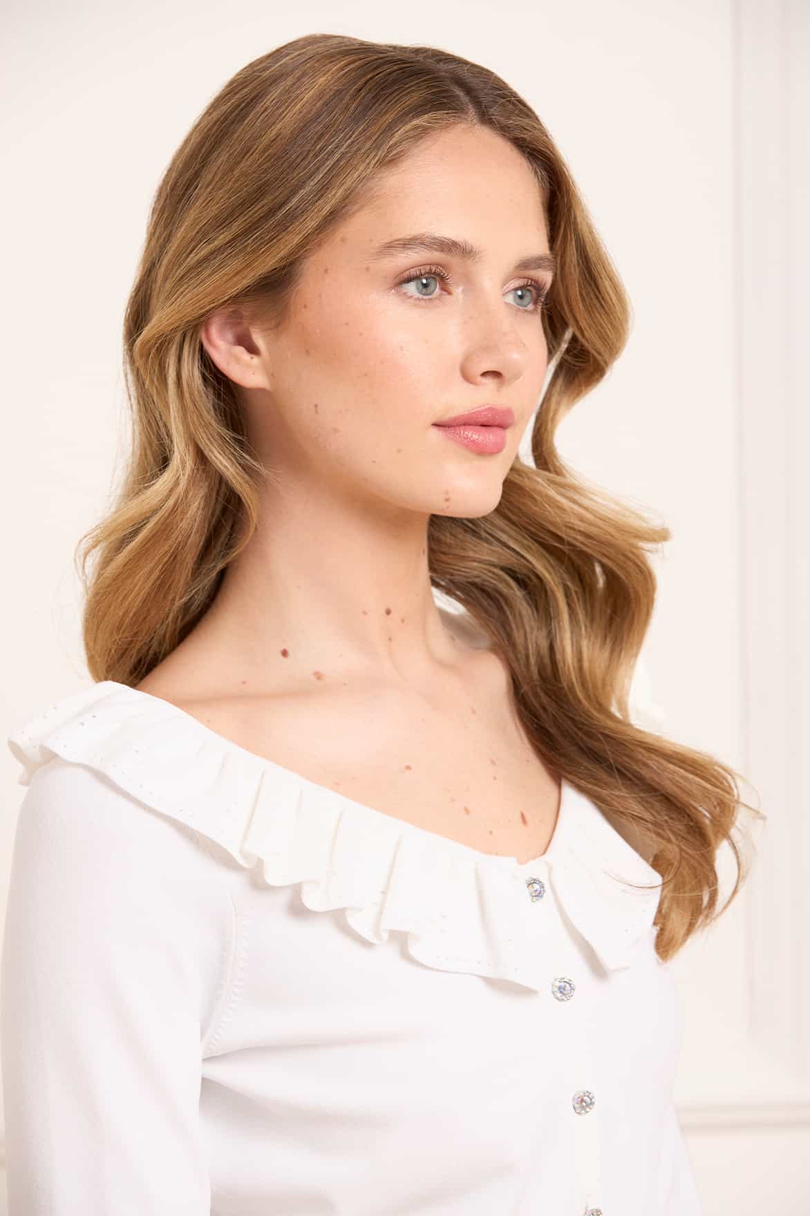 The Pointelle Trim Knit Short Cardigan in Cream. This cropped cardigan is a refined layering piece, featuring a signature Needle & Thread frill at the neckline, adorned with intricate pointelle stitch detailing. Designed with slim-fit sleeves and a shortened body length, it creates a flattering, feminine silhouette. Decorated with glittering crystal buttons, this piece adds a touch of understated sparkle, while scalloped edges along the hem, cuffs, and placket lend a delicate, couture finish. A timeless piece to elevate any look. Style with the Pointelle Trim Knit Skirt for a beautifully coordinated look.