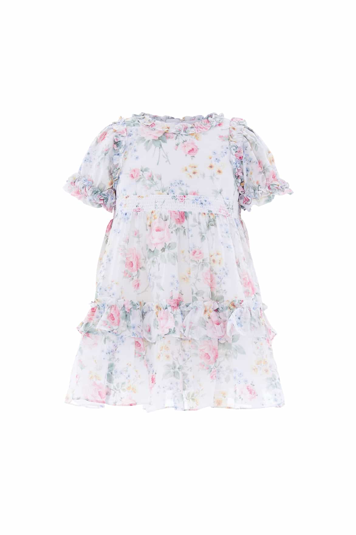 The Padour Garden Chiffon Smocked Baby Dress in Moonshine. Inspired by the luxurious wall coverings of the Palace of Versailles, this dress features hand-painted floral bouquets and trailing ditsy motifs. The smocked waistband with diamond embroidery adds elegant detail, while the soft chiffon fabric is finished with signature Needle & Thread frills. A gathered skirt with a topstitched ruffle creates a graceful silhouette, lined in cotton voile for comfort. Complete with delicate cotton dobby bloomers, edged with frills. The perfect dress for your little one’s special moments, designed with timeless elegance.
