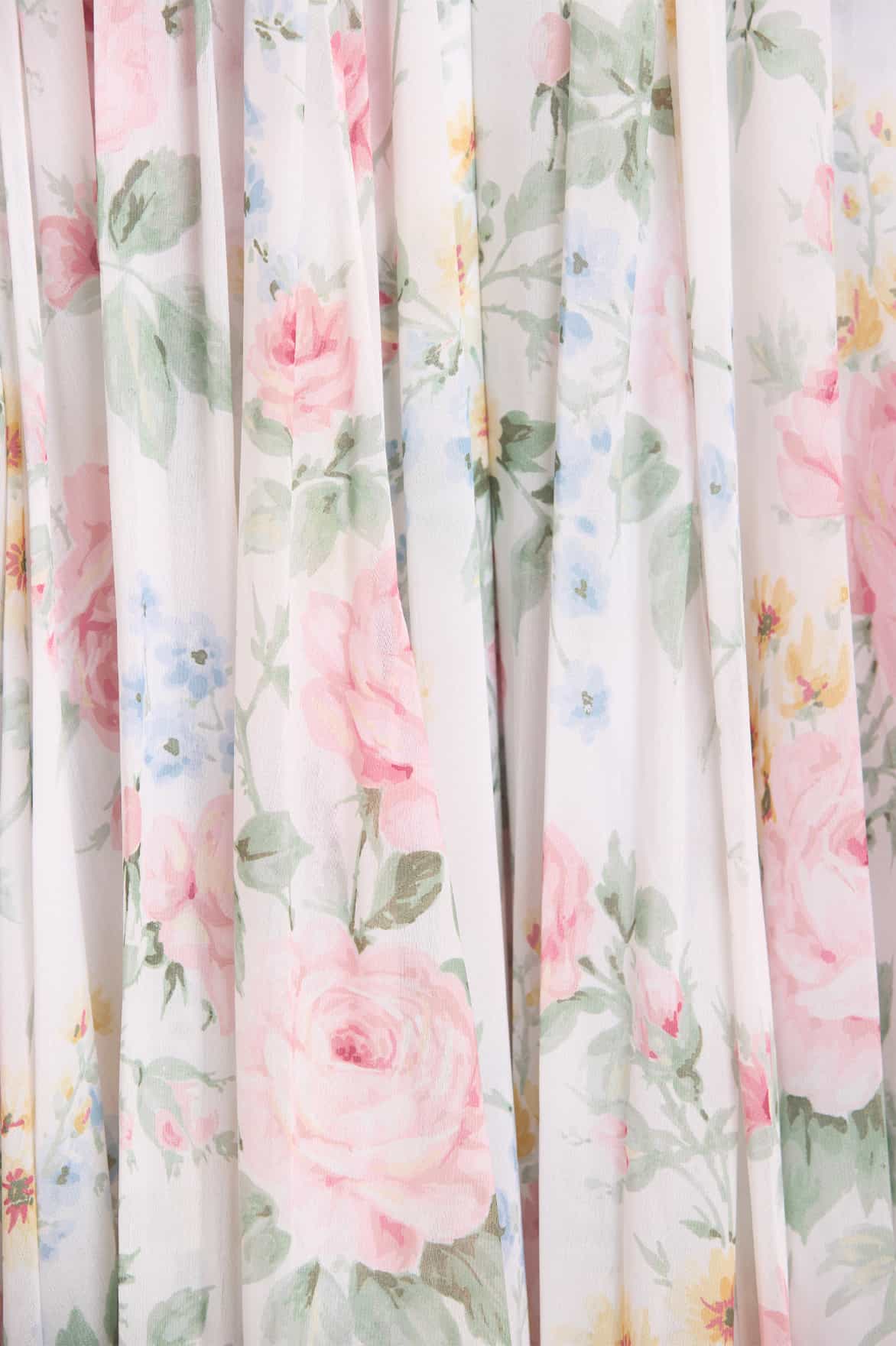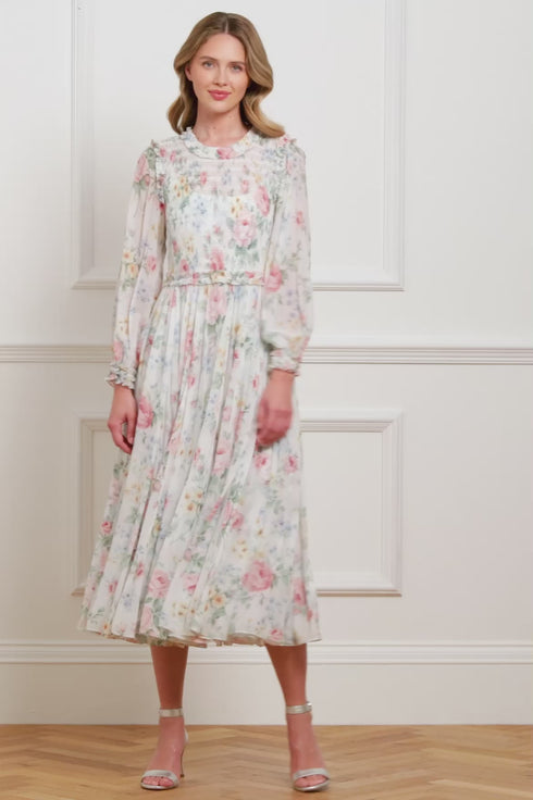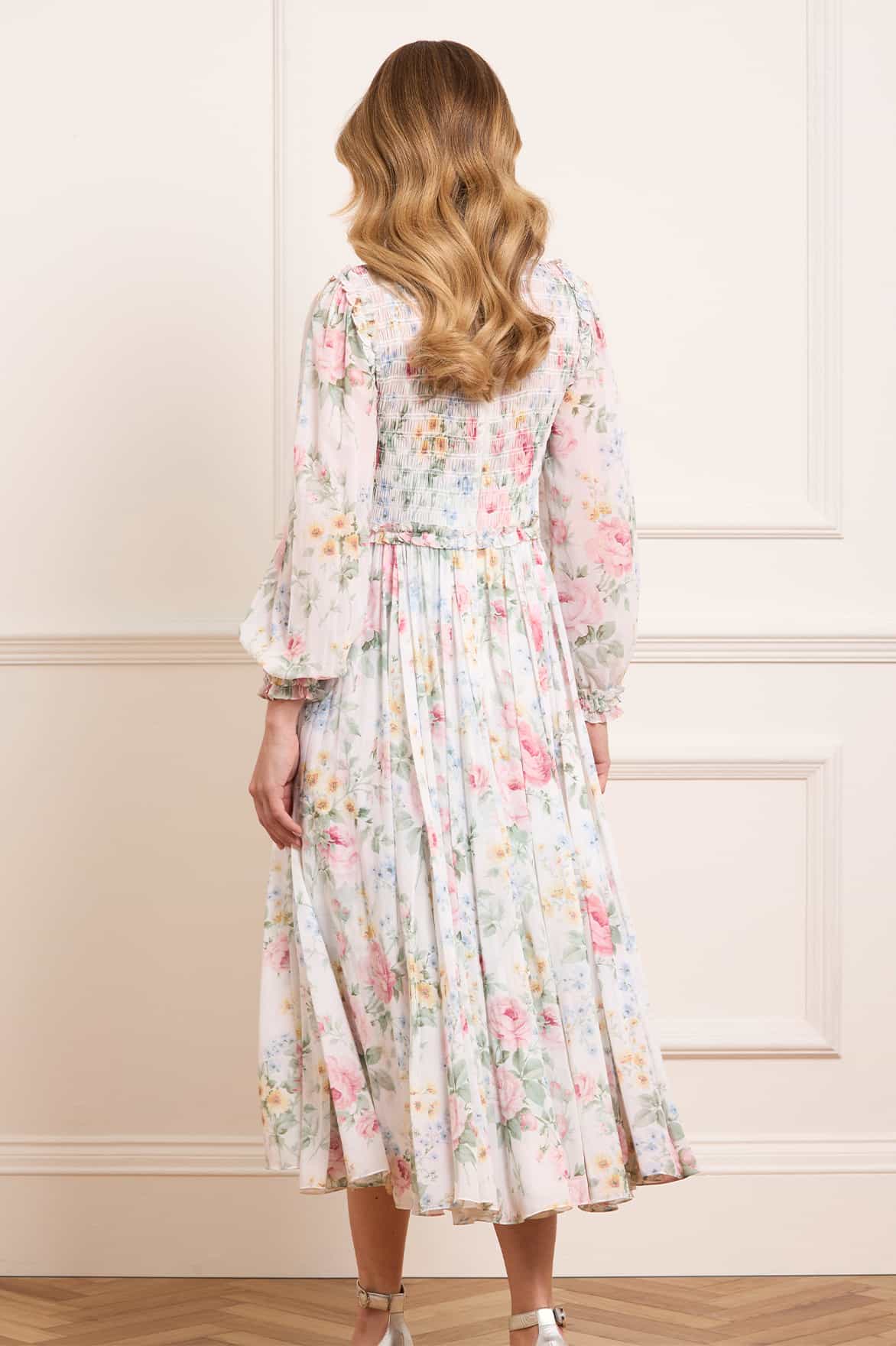 The Pompadour Garden Chiffon Smocked Ballerina Dress in Moonshine. The print of this dress is inspired by the opulent wall coverings of the Palace of Versailles, where Madame Pompadour once resided. It features exquisite hand-painted floral bouquets and trailing ditsy motifs, capturing the essence of regal elegance. Crafted from the softest chiffon, the dress showcases a shirred bodice, beautifully adorned with signature Needle & Thread frills at the neckline, shoulders, and waist. The cami straps are delicately embellished with frills for added femininity, while the softly gathered, fluid skirt is fully lined for comfort and movement.
