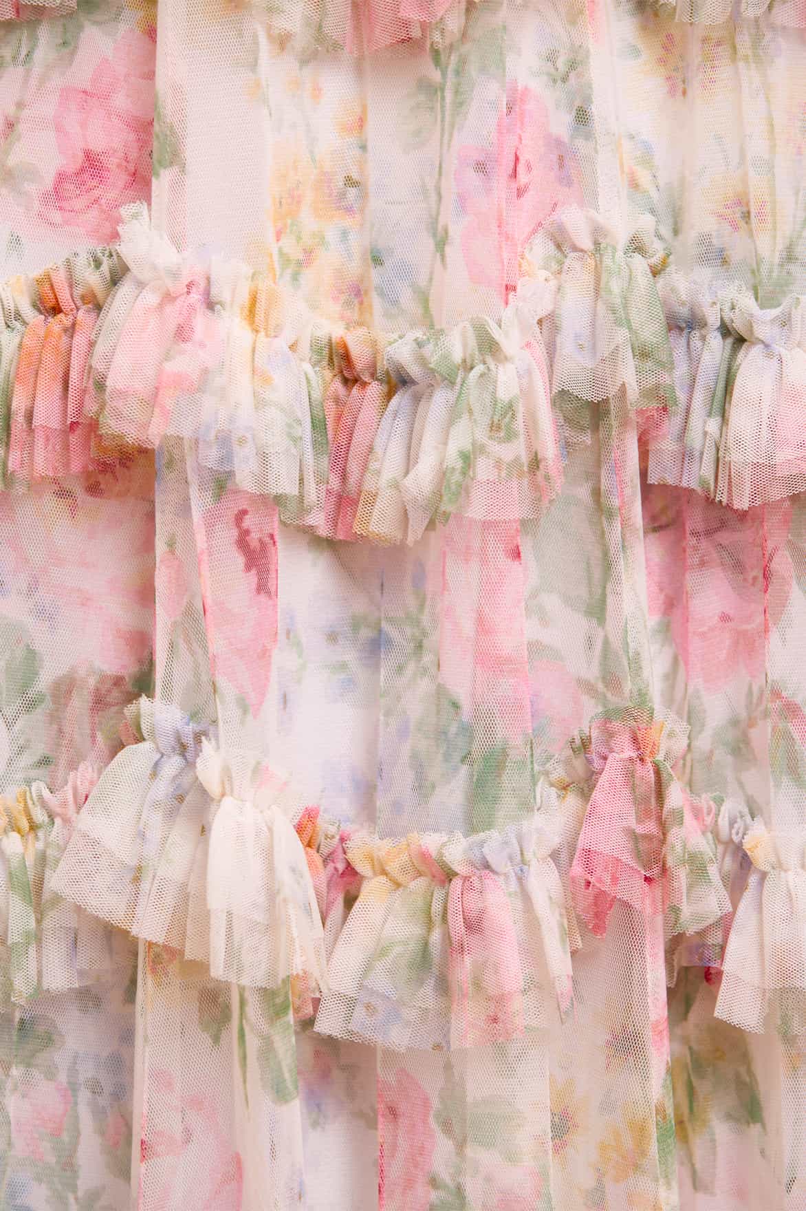 The Pompadour Garden Round Neck Gown in Moonshine. Inspired by the opulent wall coverings of the Palace of Versailles, this gown features luxurious hand-painted floral bouquets and trailing ditsy motifs, exuding timeless elegance. The frothy short sleeves, crafted from gathered tulle frills, add a romantic touch, while signature Needle & Thread frills adorn the neckline. Delicate scalloped borders and frills create a textured, ethereal effect throughout, making this gown a true embodiment of luxury and artistry.