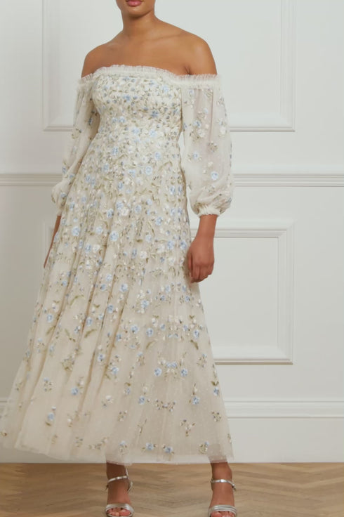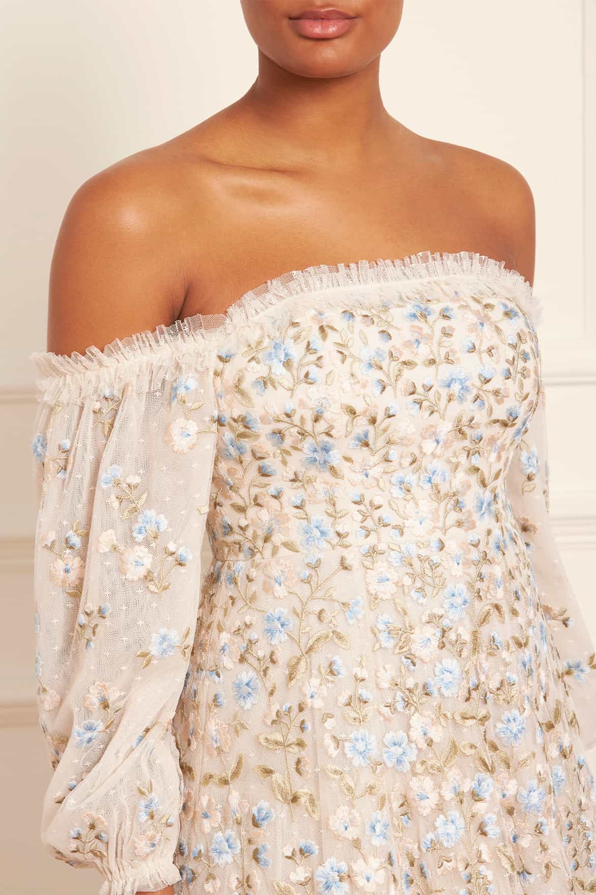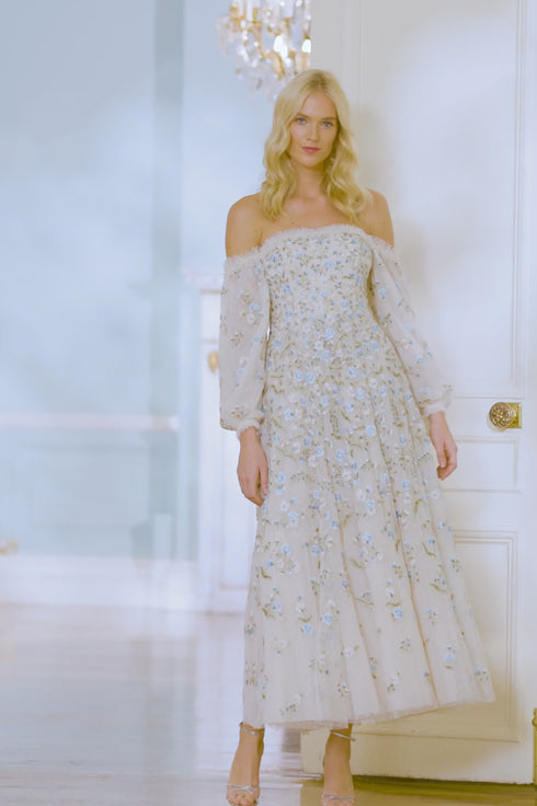 The Posy Pirouette Off-Shoulder Ankle Gown in Cream / Blue. A statement style for the season ahead. This gown is beautifully embroidered with intricate, rich posy florals scattered all-over and dispersing towards the hem. Developed with an off-the-shoulder design and adorned with soft, tulle ruffles adding a romantic finish. The sleeves are crafted using layers of tulle net for a more structured look. Crafted with a net tulle generous skirt with a sweeping hemline. A traditional yet stylish gown.