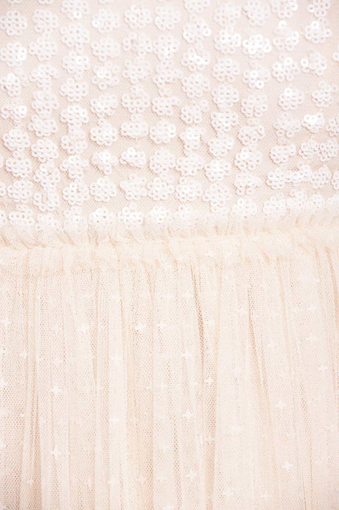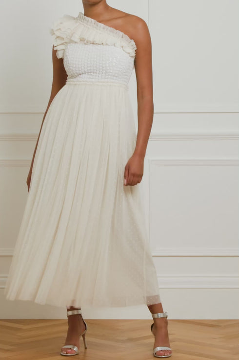 The Raindrop Bodice One Shoulder Ankle Gown in Cream / Cream. The bodice of this gown is adorned with an enchanting sequin artwork. The artwork is designed with delicate shimmering polka dot sequins in a linear formation capturing the essence of glistening raindrops. Designed with an off-the-shoulder style for elegant detailing. The skirt is made from layers of frothy tulle featuring statement frill details, creating a signature romantic look. The gown is perfect for an upcoming special event.