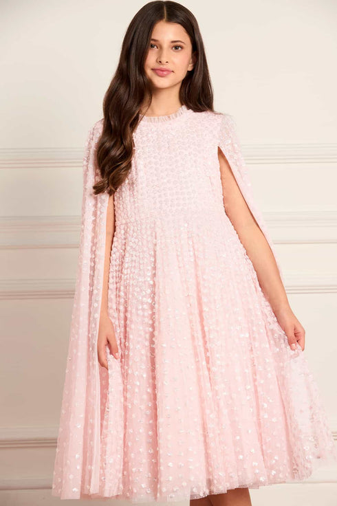 NEW SEASON. The Raindrop Cape Kids Dress in Seashell. Shimmers with scattered sequins inspired by raindrops on glass. Featuring a fluttering cape overlay, it’s a magical design made for dancing and delight.