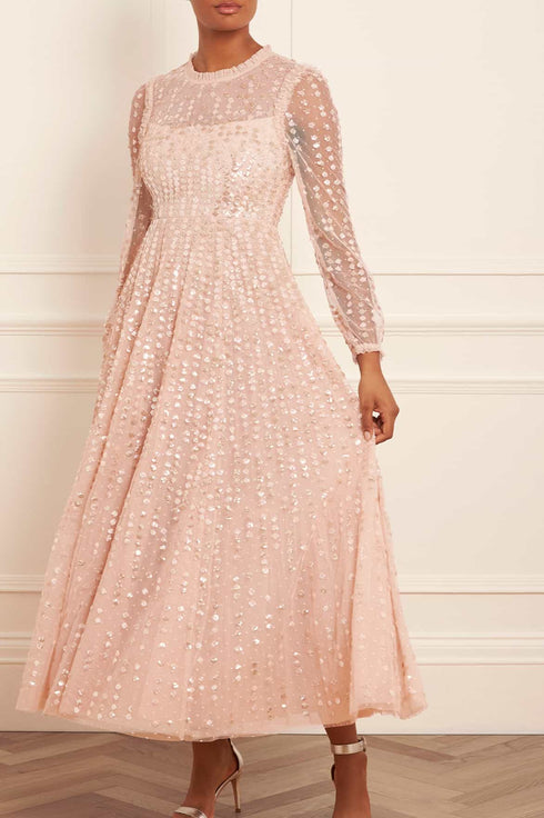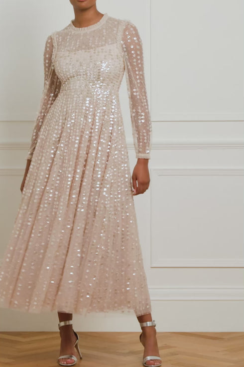 The Raindrop Long Sleeve Ankle Gown in Pebble / Metallic. A new fairytale piece for the season ahead. This gown is beautifully adorned with an enchanting sequin artwork. The artwork is designed with delicate shimmering polka dot sequins in a linear formation capturing the essence of glistening raindrops. Designed with long sheer sleeves for an elegant look. The skirt is made from layers of frothy tulle featuring statement frill details, creating a signature romantic look. The gown is perfect for an upcoming special occasion.