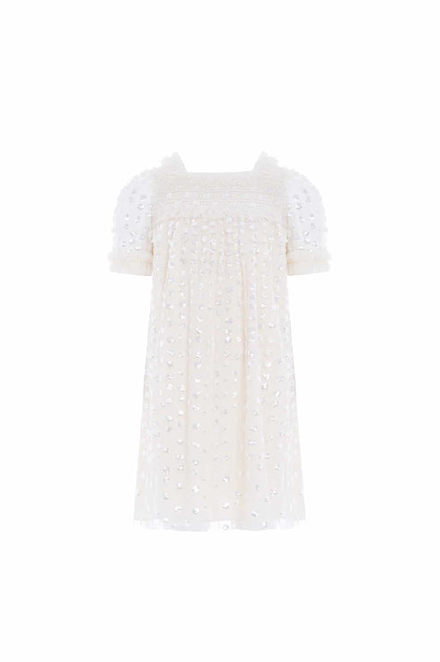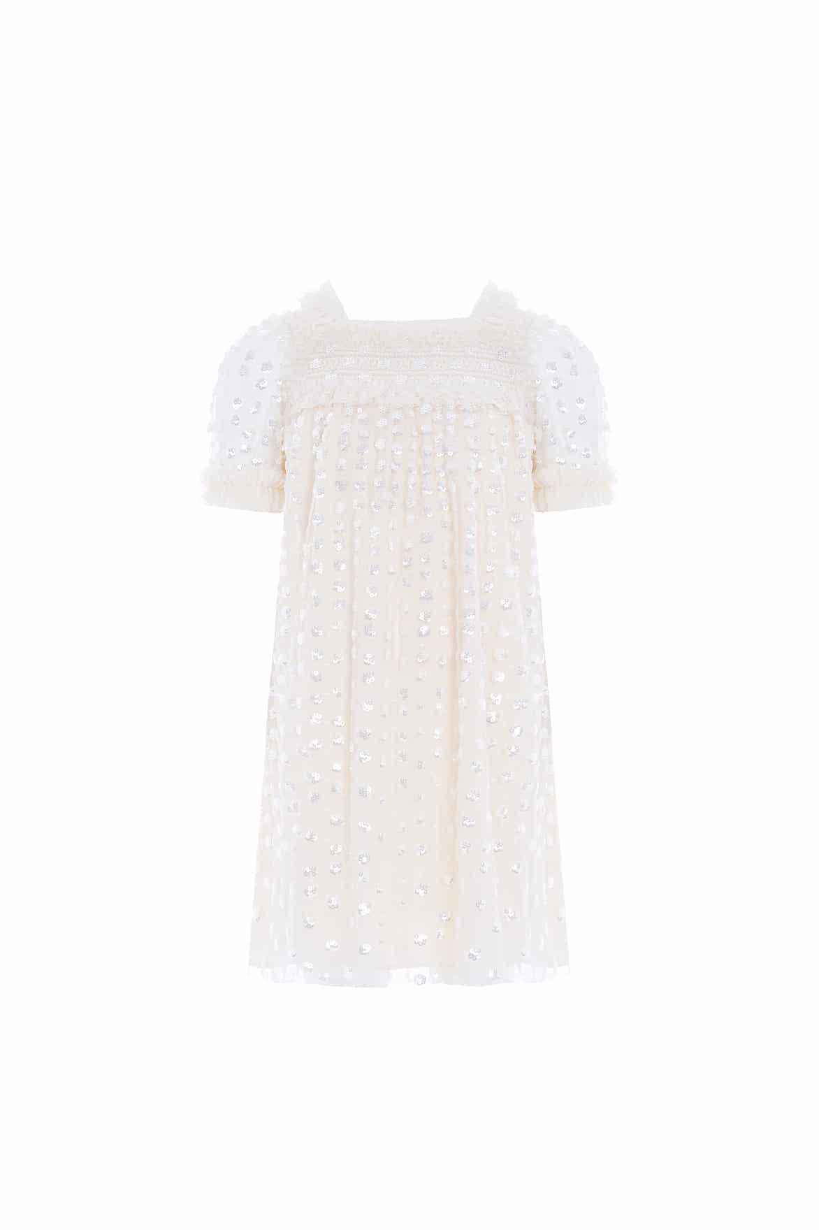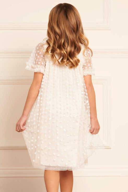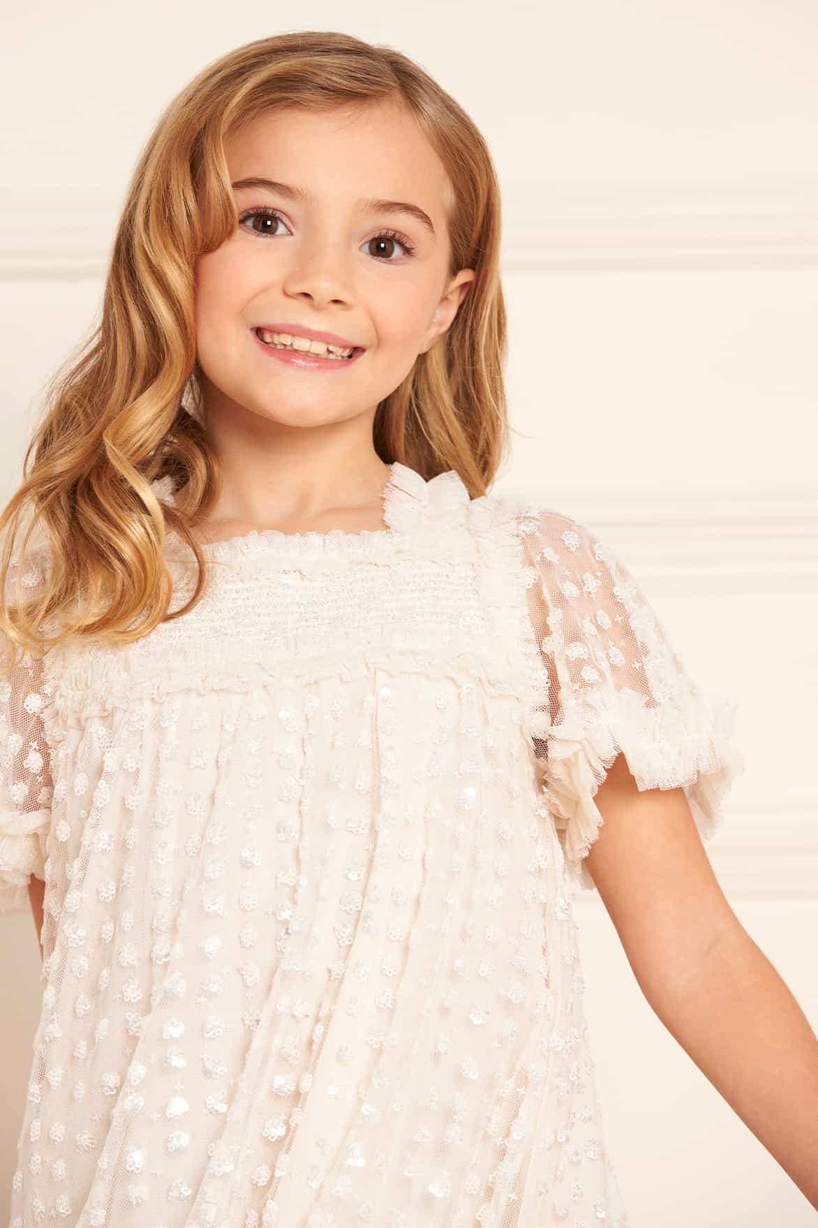 The Raindrop Smocked KIDS Dress in Cream. This dress is decorated with a polka dot sequin motif in a linear formation, beautifully capturing the essence of glistening raindrops. Developed with special high-shine sequins to create a charming, shimmering effect. The skirt boasts layers of tulle and net for a playful, voluminous effect. The bodice of the dress is developed with a 'smocked' design for stretch and comfort. The perfect dress for an upcoming special event.
