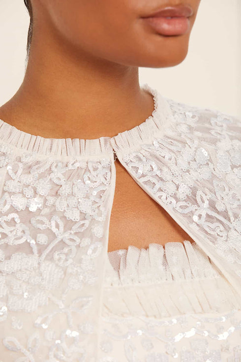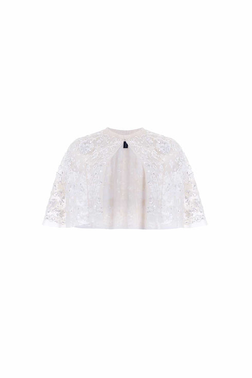 The Regal Rose Gloss Short Open Cape in Cream. This cape is decorated with an elegant, floral artwork featuring delicate lace. Beautifully designed to sit over our Regal Rose Gloss Strapless Gown. Designed with a front opening purposely shaped to reveal the dress details. This cape can be used as a styling piece or to layer over the matching gown.