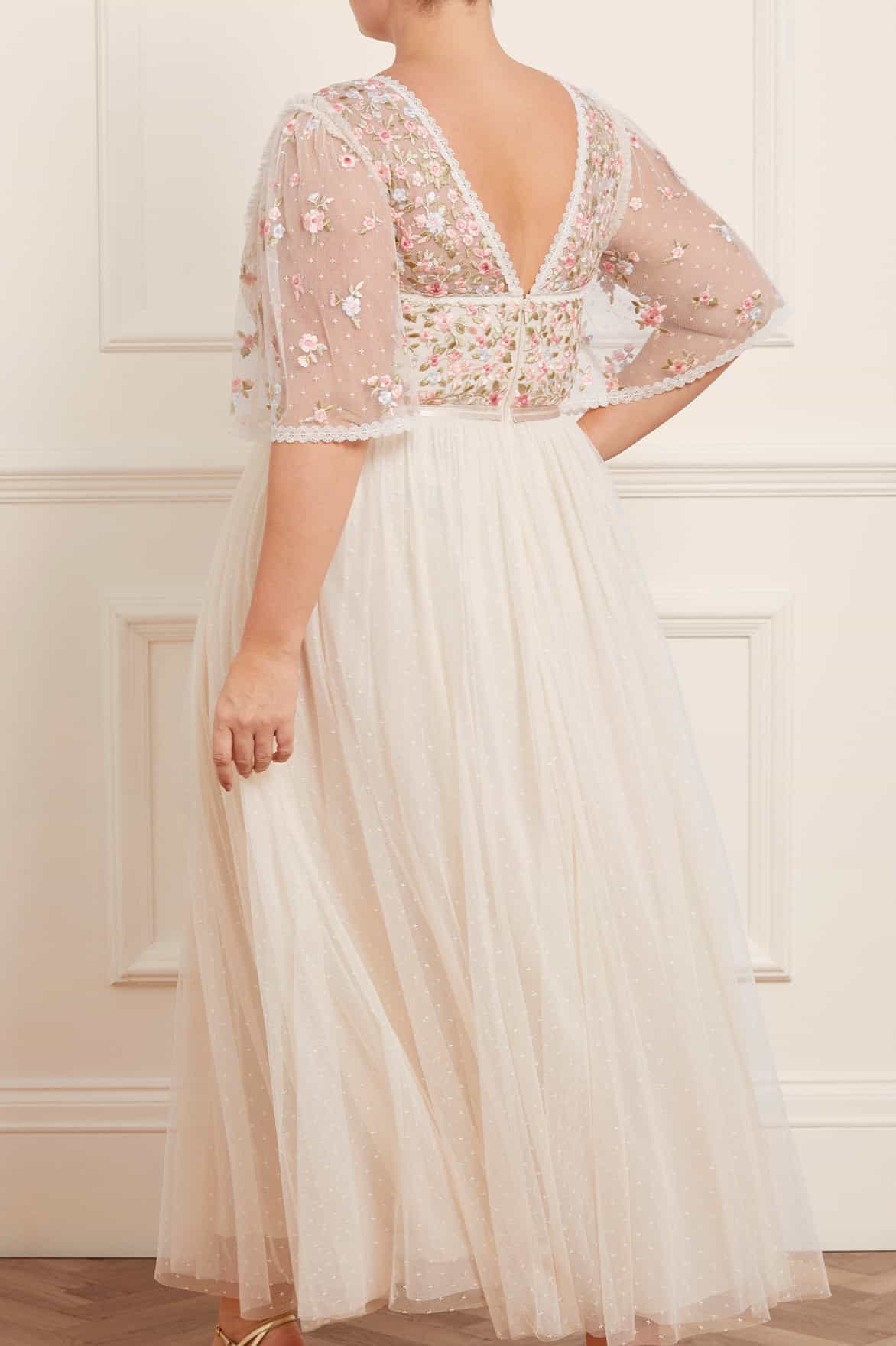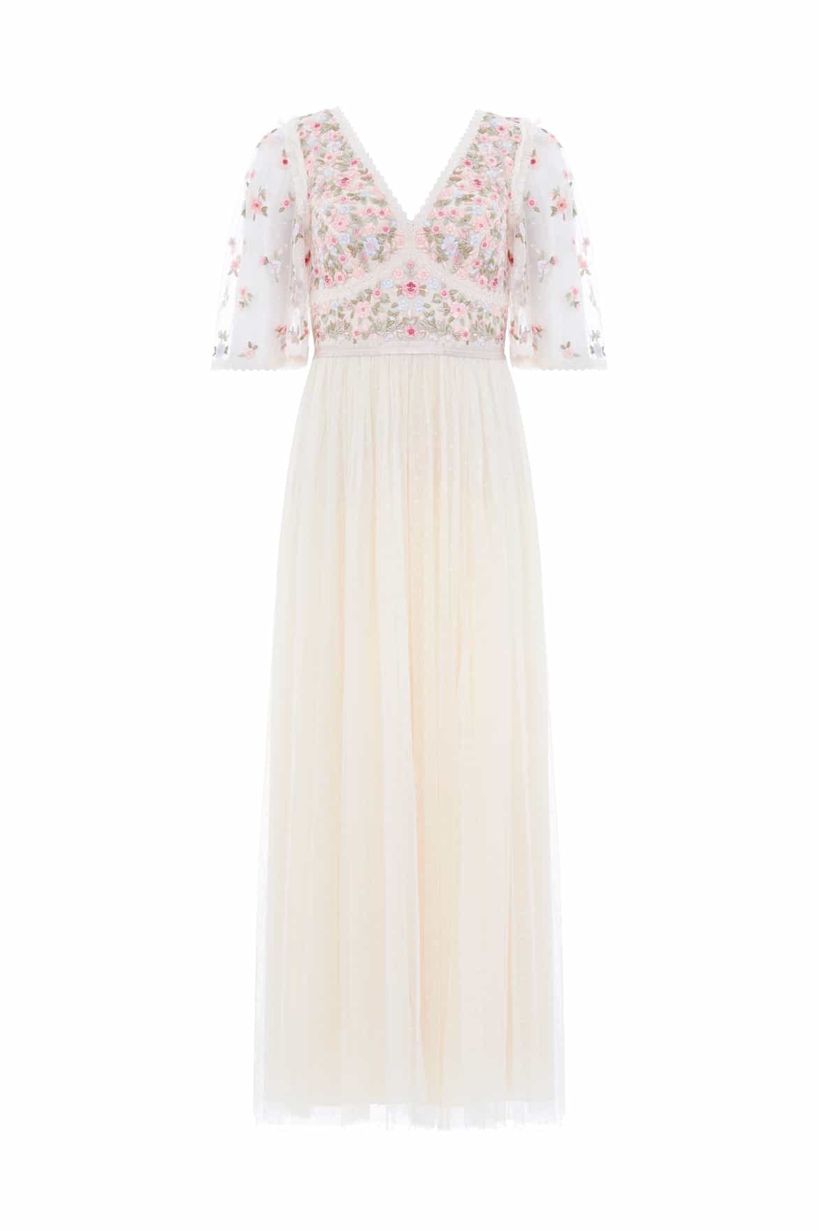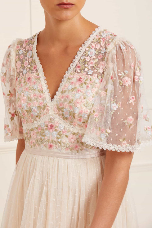 The Ribbon Bouquet Bodice Ankle Gown in Champagne / Pink Multi. The bodice of this gown is intricately designed with embroidered bouquets of flowers in rich tones, inspired by a 1930s vintage print. Beautifully adorned with delicate lace trims for signature Needle & Thread detailing. The skirt features layers of tulle to create a romantic silhouette. The perfect gown for an upcoming occasion.