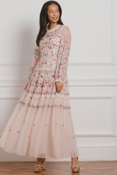 NEEDLE & THREAD EXCLUSIVE. The Ribbon Bouquet Gown in Petal Pink. This gown is intricately designed with embroidered bouquets of flowers in rich tones, inspired by a 1930s vintage print. Beautifully adorned with delicate lace trims for signature Needle & Thread detailing. The skirt is developed with layers of tulle to create a romantic silhouette. The perfect gown for an upcoming occasion.