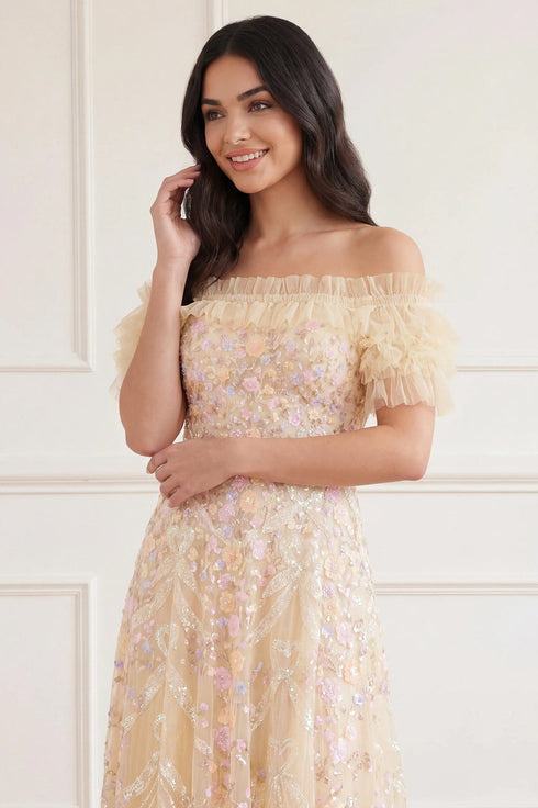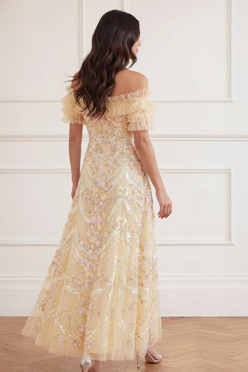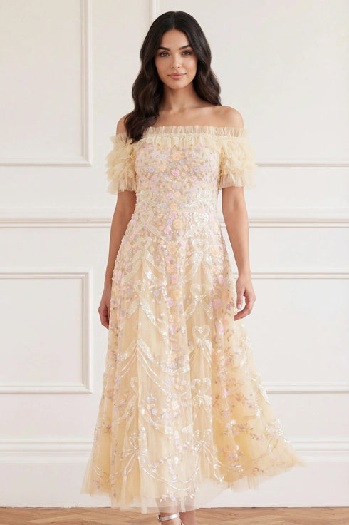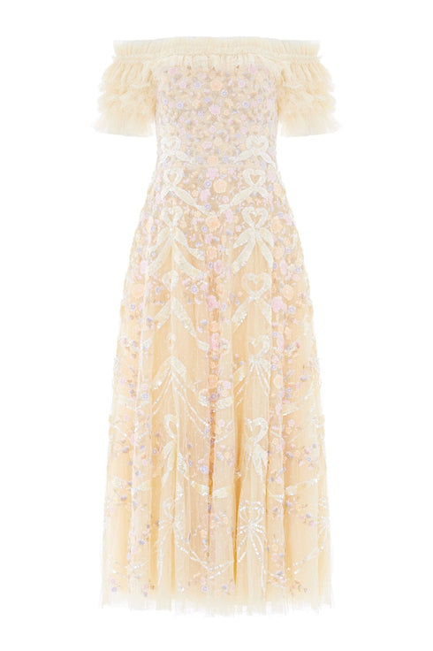 NEW SEASON. The Ribbon Heart Off-Shoulder Ankle Gown in Lemon Sorbet/Multi. Adorned with charming ribbon heart motifs, this gown offers a playful yet elegant take on occasion dressing. The off-shoulder neckline and flowing ankle-length skirt create a softly romantic silhouette.
