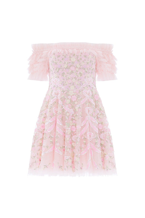 NEW SEASON. The Ribbon Heart Off-Shoulder Micro Mini Dress in Peony Pink/Multi. A playful micro mini silhouette adorned with ribbon heart motifs inspired by romantic garden details. Designed with an off-shoulder neckline, this style balances femininity with a modern, statement feel.
