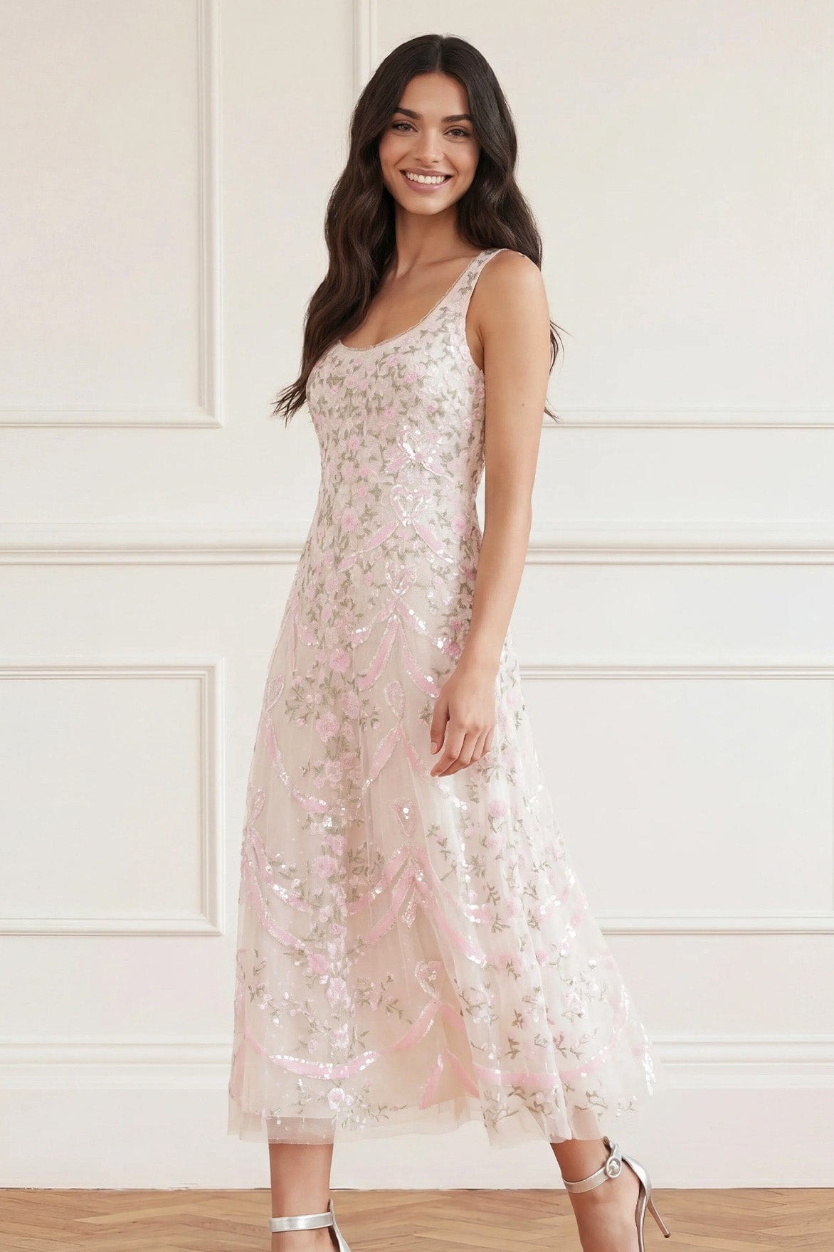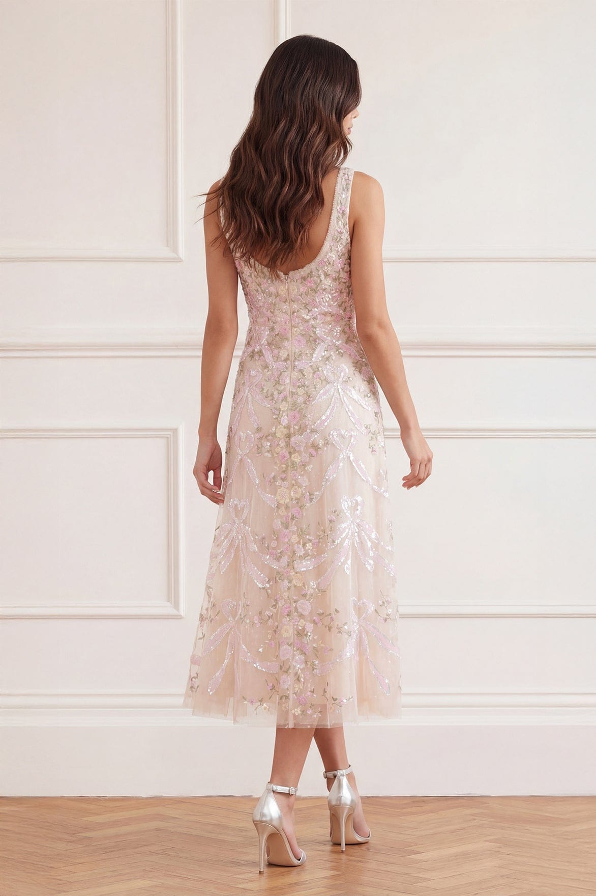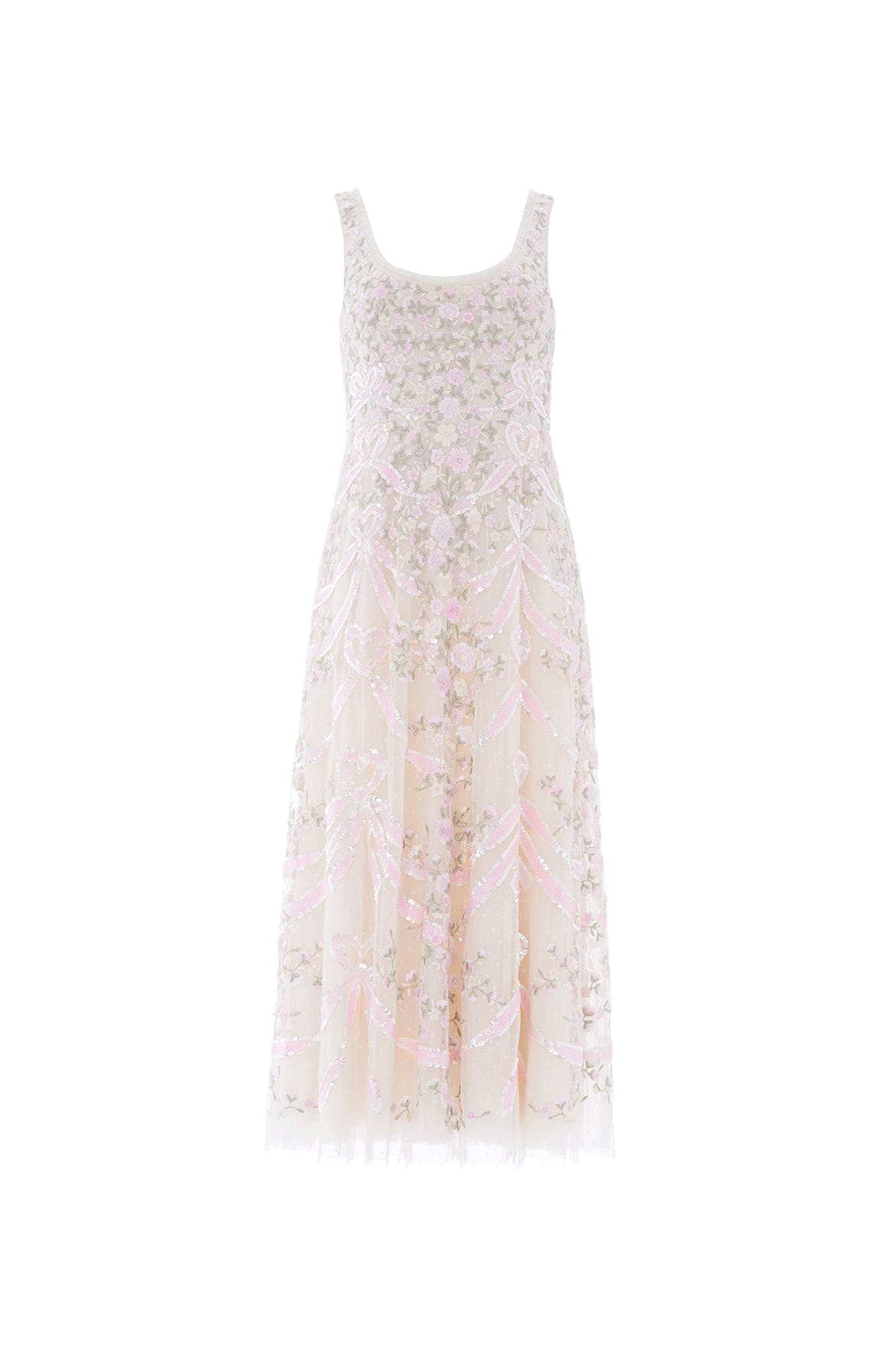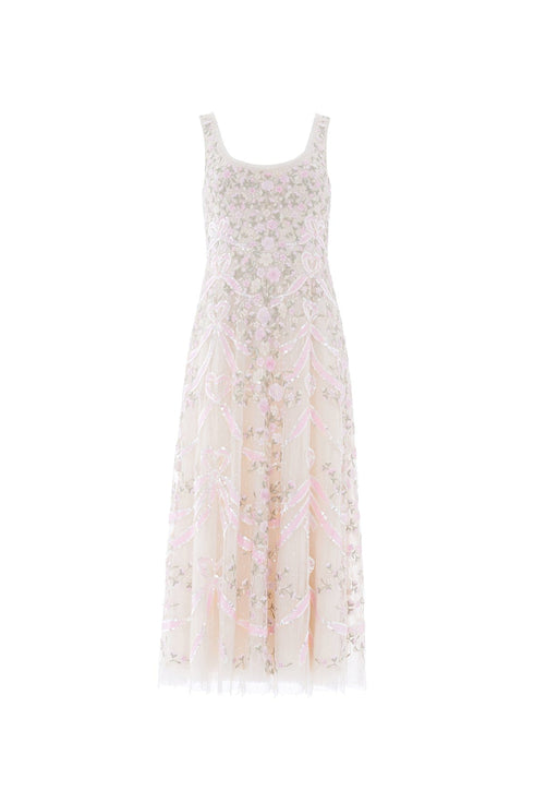 NEW SEASON. The Ribbon Heart Scoop Neck Ballerina Dress in Cream/Multi. This romantic ballerina dress features ribbon heart motifs scattered across the design for a whimsical finish. Designed with a scoop neckline and a voluminous skirt, it offers light movement and elegant charm.
