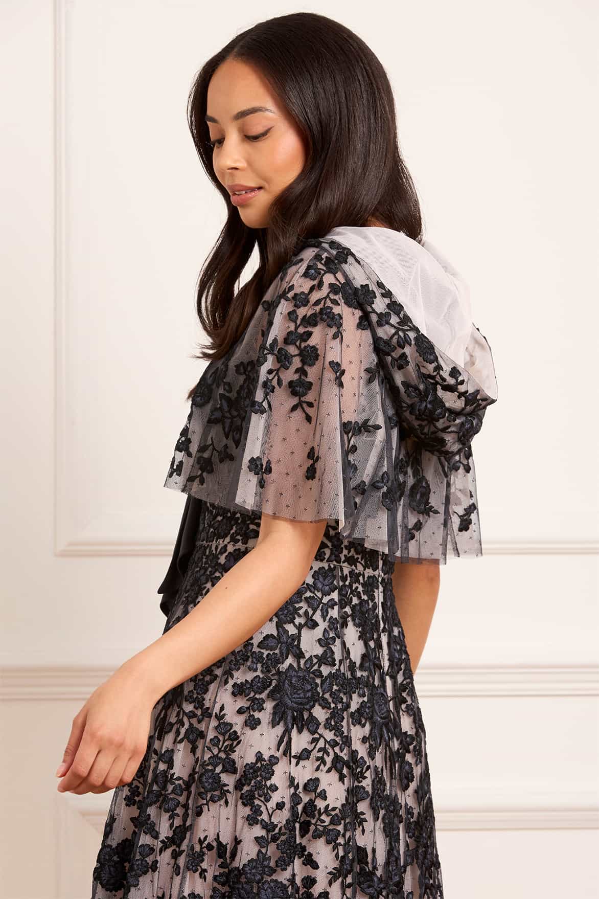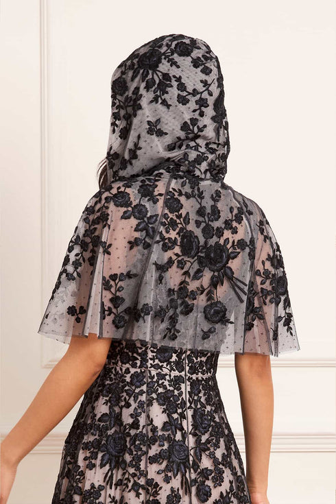 The Rosa Hooded Short Cape in Graphite/Opal. This cropped embroidered cape is designed to complement the matching Rosa Scoop Neck Ankle Gown. Adorned with bold rose and ditsy motifs, the cape fastens with a soft chiffon bow at the neckline. Perfect for making a dramatic and romantic statement.