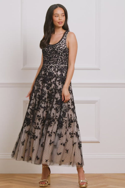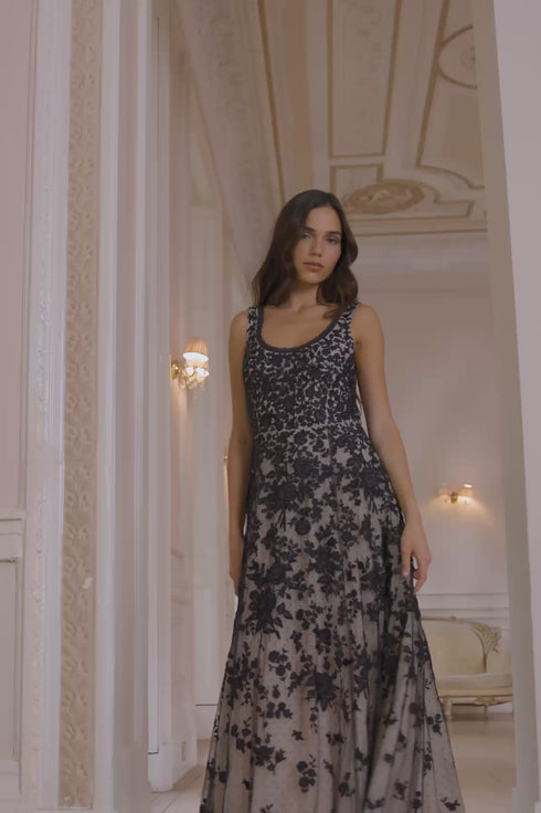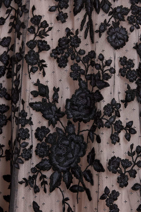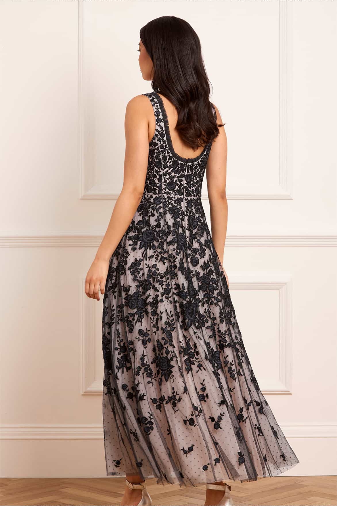 The Rosa Scoop Neck Ankle Gown in Graphite/Opal. This beautiful dress is a bold, elegant style featuring oversized rose motifs inspired by 19th-century archive paintings. With florals blooming across the bodice and softening into trailing ditsies at the hem, this gown flatters with a scoop neckline and a softly flowing skirt. Pair with the Rosa Hooded Cape for a truly romantic ensemble.