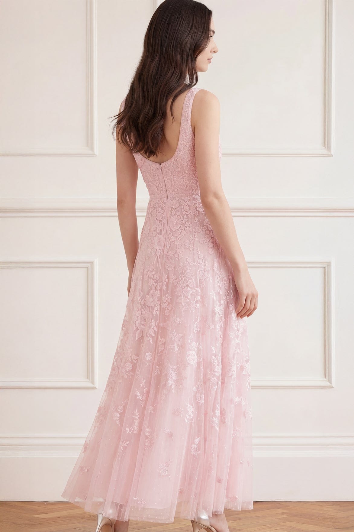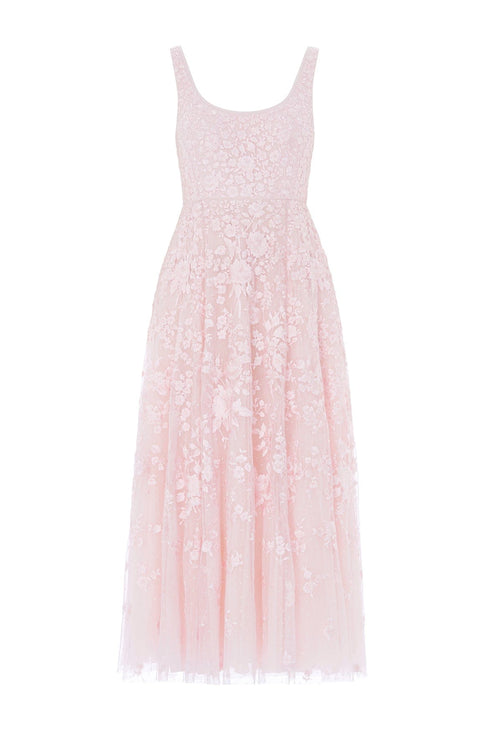 NEW SEASON. The Rosa Sleeveless Scoop Neck Ankle Gown in Powder Lilac/Peony Pink. This elegant gown features signature floral embroidery inspired by garden blooms, arranged across a sleeveless silhouette. Finished with a scoop neckline and flowing ankle-length skirt for soft, feminine movement.