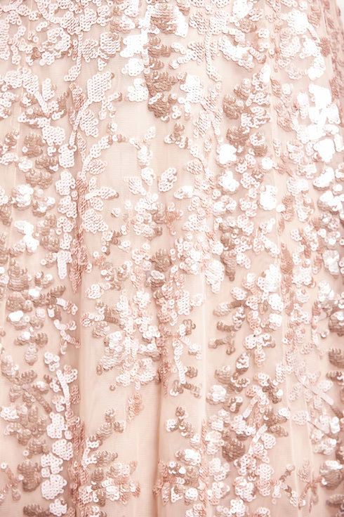 NEW SEASON. The Rosanna Lattice Round Neck Gown in Oyster/Metallic. Floral sequins and lattice embroidery shimmer across sheer tulle layers, gradually dispersing into delicate scatter motifs. The light base lends softness, while metallic threadwork glitters like moonlight on water. Cut with a round neckline, slim bodice, and flowing skirt, this gown offers timeless femininity and evening grandeur.