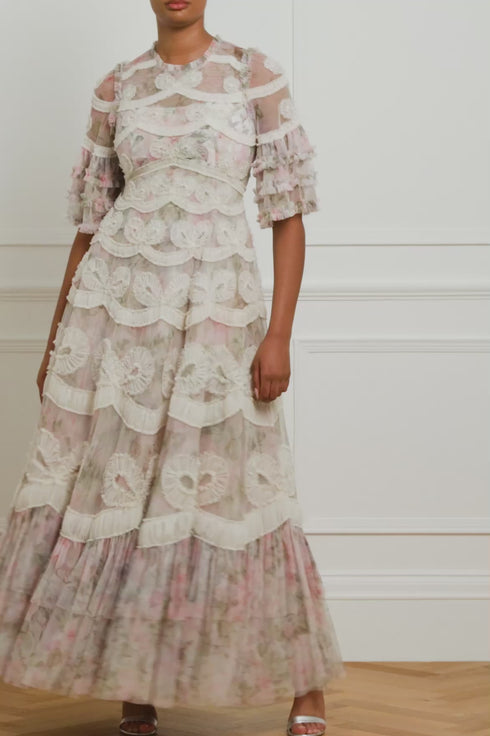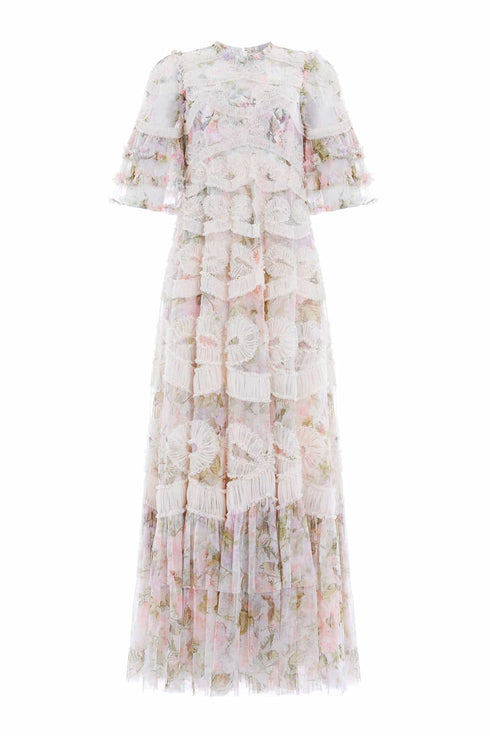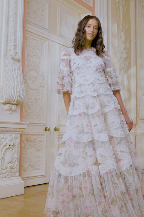 The Rose Powder Ingrid Gown in Moonshine. This gown is inspired by a 1900s hand-painted wallpaper design. Beautifully printed with florals in faded pastels for a vintage look. Engineered with delicate tulle and subtle texture to capture this ribbon motif. This signature Needle & Thread gown is bold yet truly romantic. We hope you love this gown as much as we do.