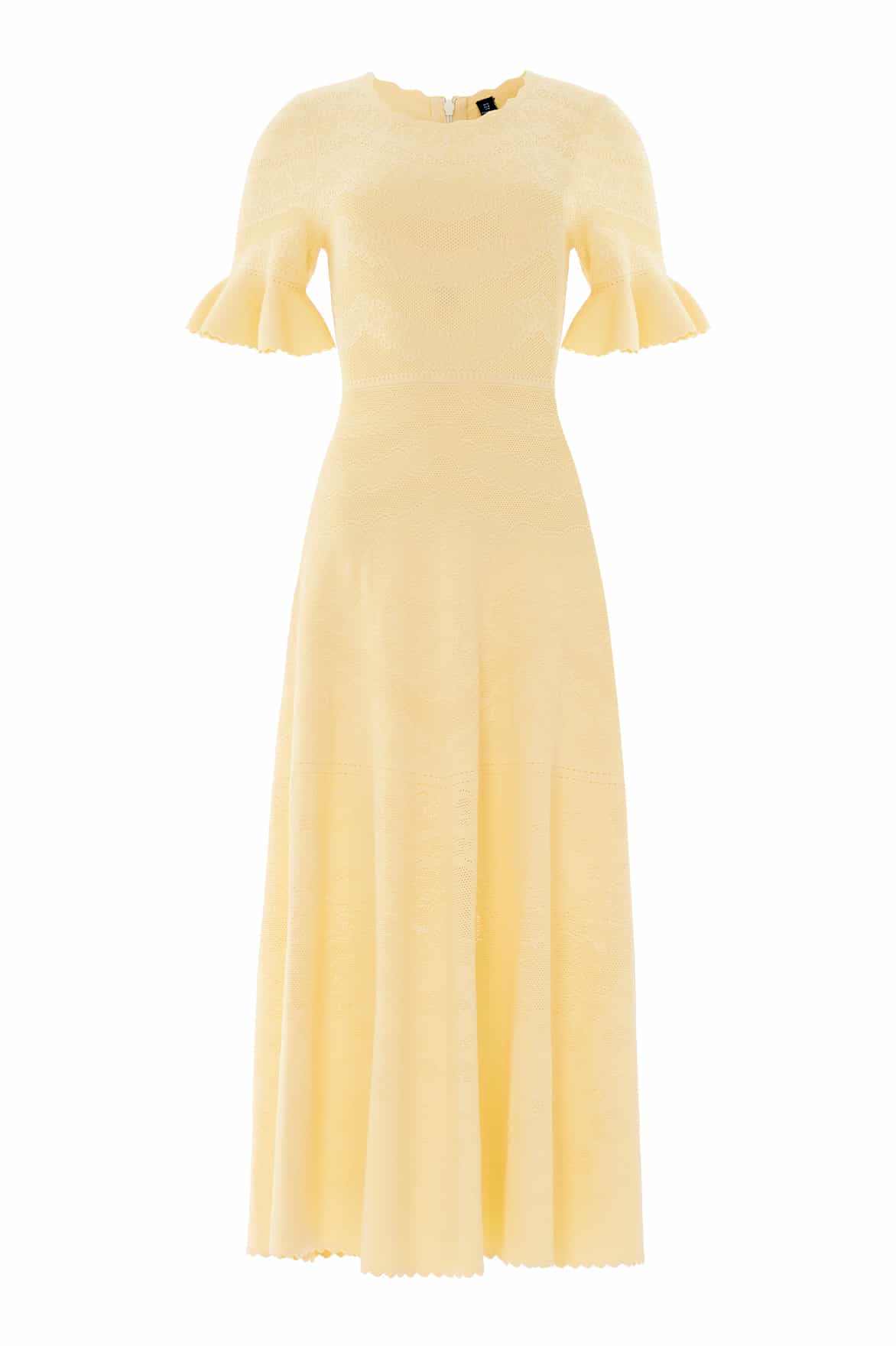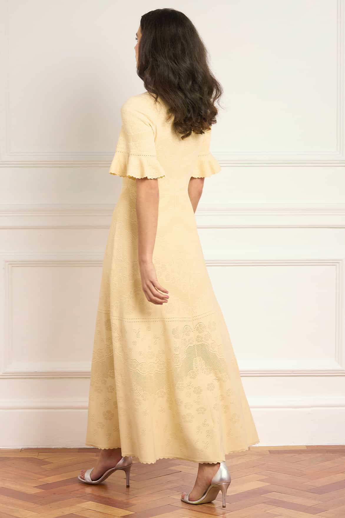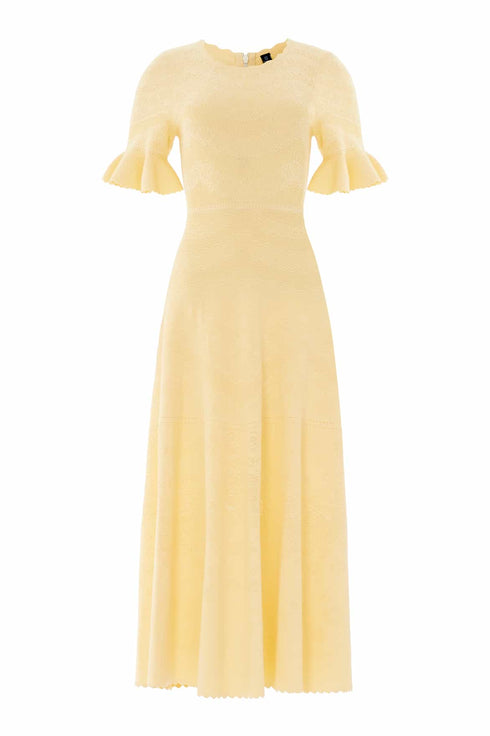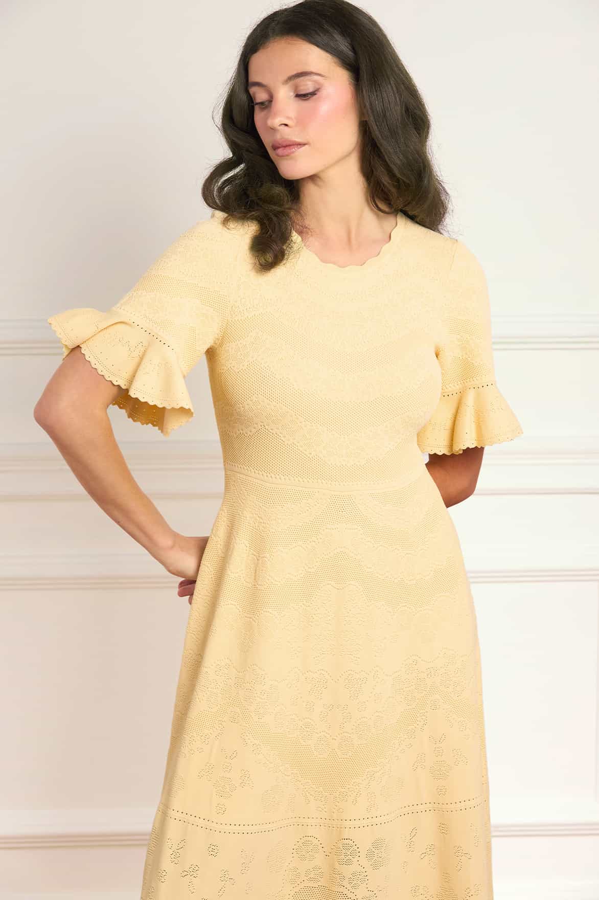 NEW SEASON. The Scallop Lace Pointelle Knit Gown in Citron. This elegant knit gown features delicate scallop lace detailing inspired by romantic vintage lacework. Designed with a softly fitted silhouette, it offers effortless elegance with a modern, feminine feel.