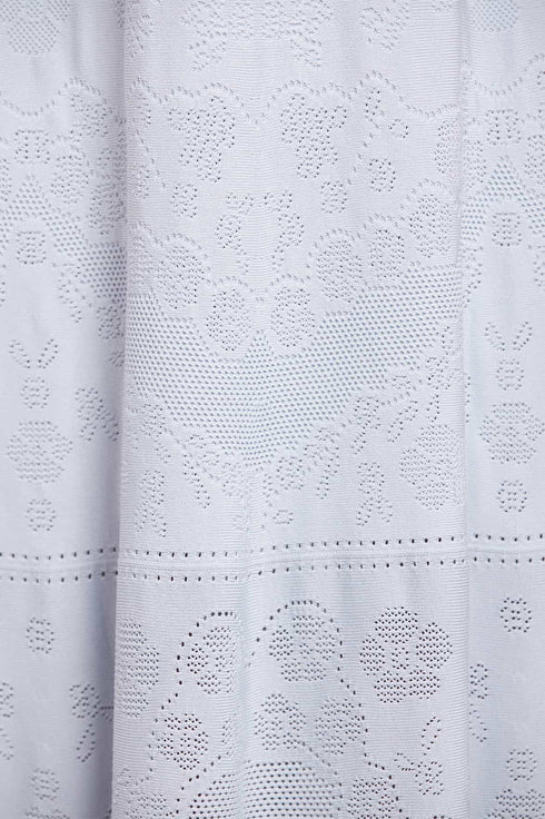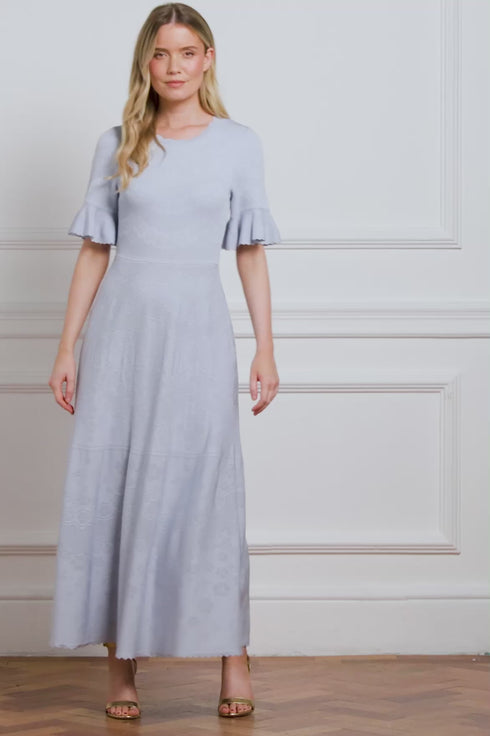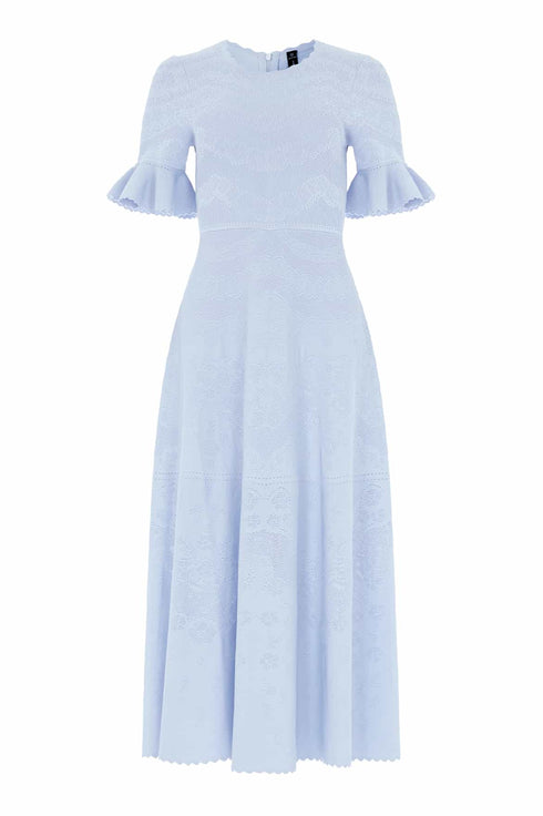 NEW SEASON. The Scallop Lace Pointelle Knit Gown in Skylight. A graceful knit design with a scalloped neckline and soft lace detailing. Combining delicate craftsmanship and fluid drape, it offers a modern twist on timeless romance.