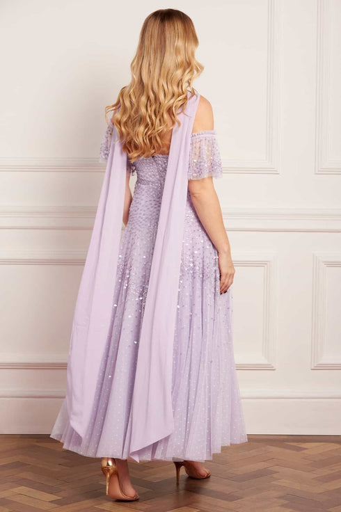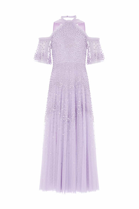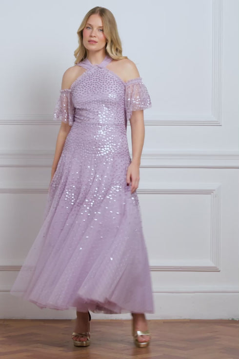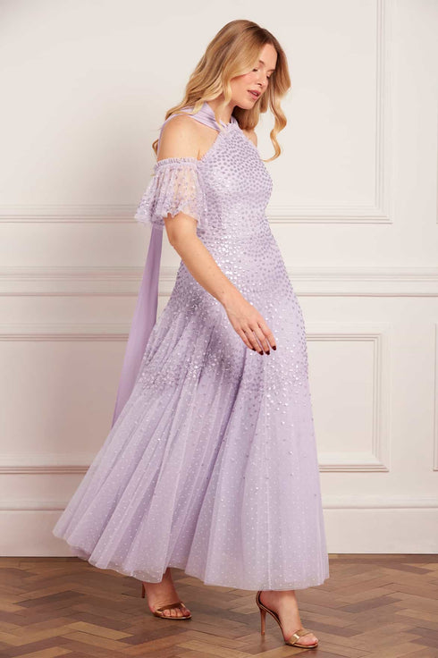 NEW SEASON. The Scallop Sequin Halter-Neck Ankle Gown in Lavender. Features delicate clusters of sequins forming soft scalloped patterns across the bodice. Complete with a statement halter sash, this gown shimmers with understated glamour and timeless femininity.