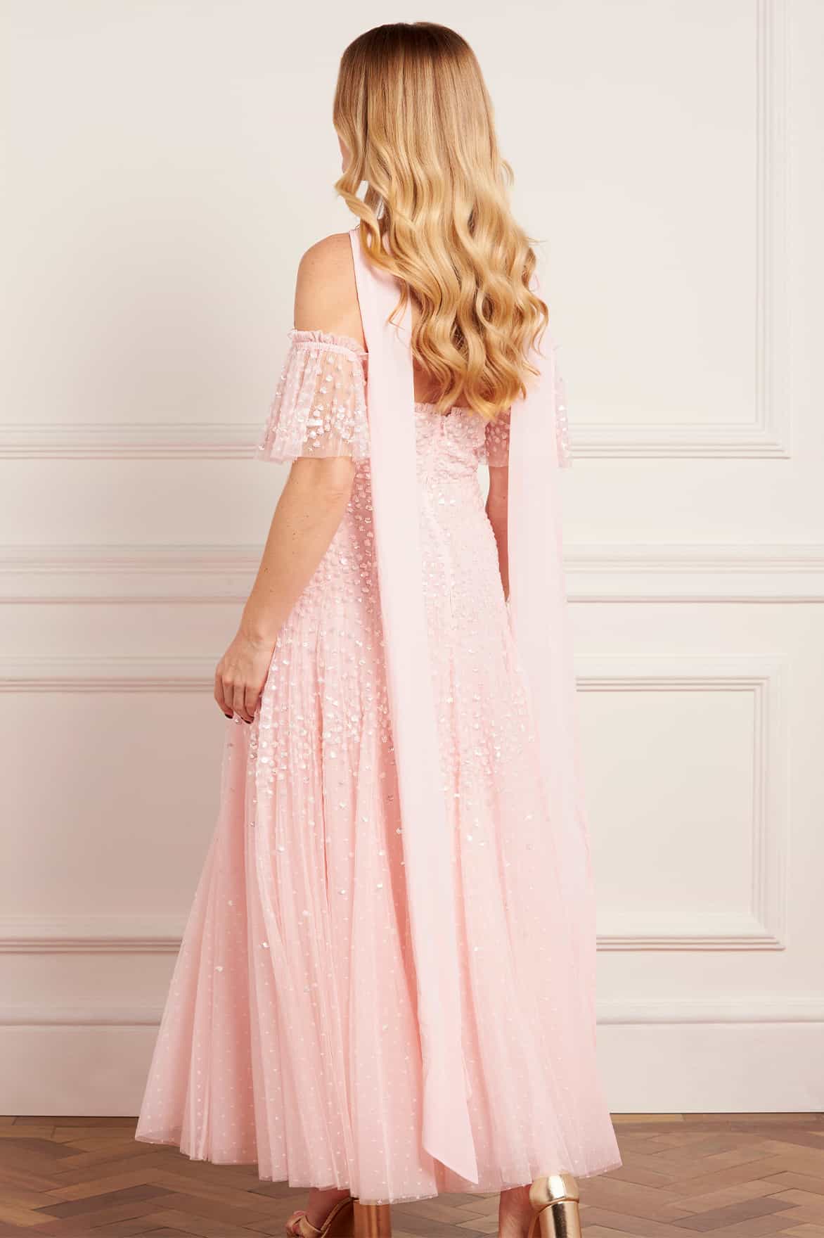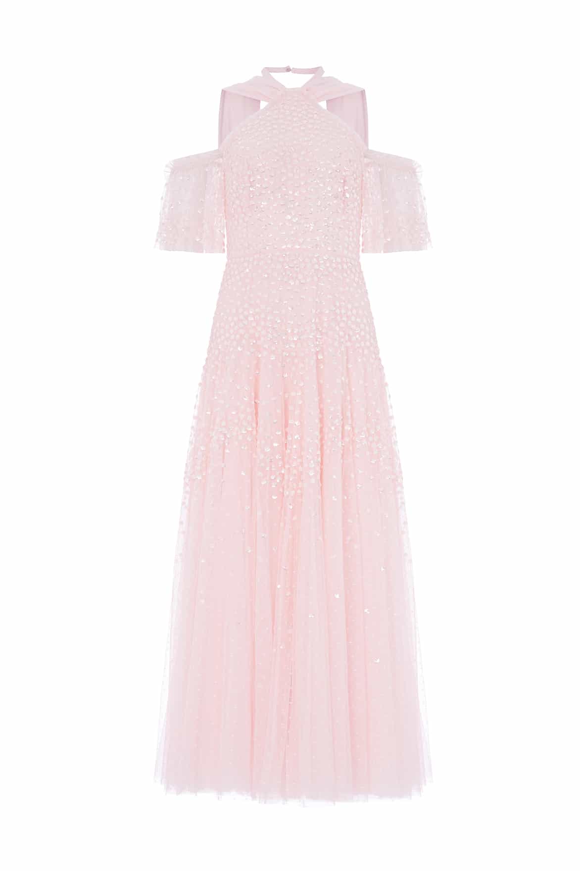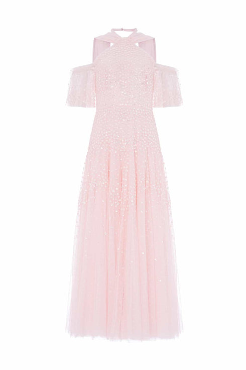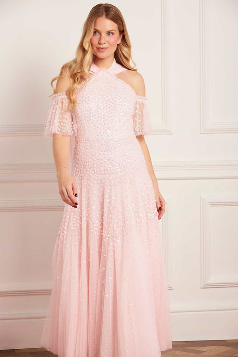 NEW SEASON. The Scallop Sequin Halter-Neck Ankle Gown in Seashell. Embellished with clusters of shimmering sequins forming a subtle scalloped design. Finished with a dramatic sash tie at the back, this halter style offers a refined, elongated silhouette perfect for evening occasions.