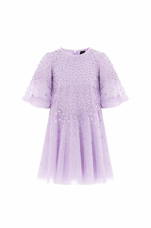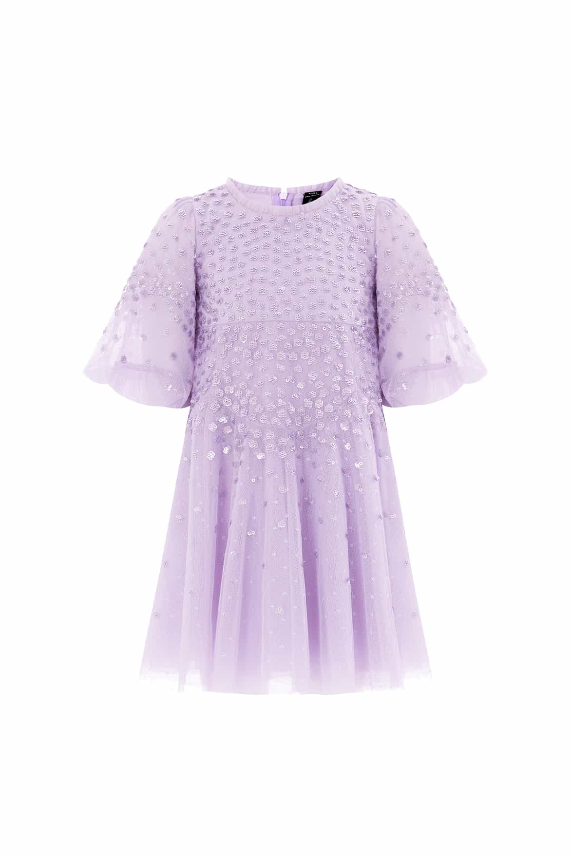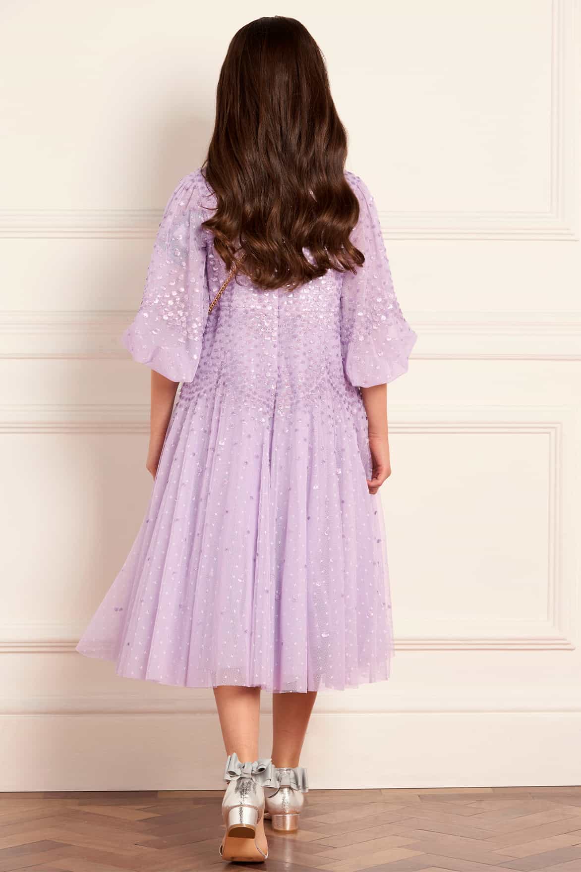 NEW SEASON. The Scallop Sequin Kids Dress in Lavender. Clusters of tiny sequins glisten forming delicate scalloped waves. Its pastel tone and flowing silhouette make it a perfect choice for joyful celebrations. This piece pairs perfectly with the Scallop Sequin V-Neck Ankle Gown from the womenswear line for a matching special-occasion look.