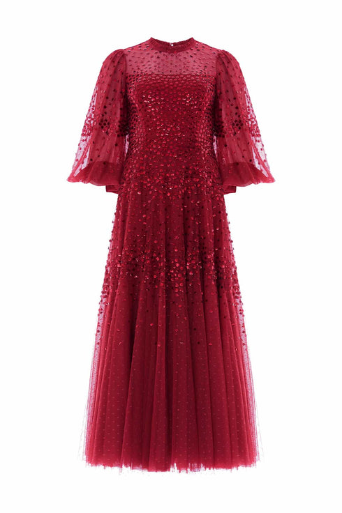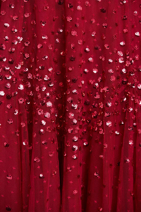 NEW SEASON. The Scallop Sequin Round Neck Ankle Gown in Red. Sequined scallops sweep across the bodice and skirt, catching light with every movement. The rich red tulle intensifies its dramatic spirit, making this gown unforgettable for any occasion.