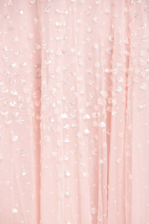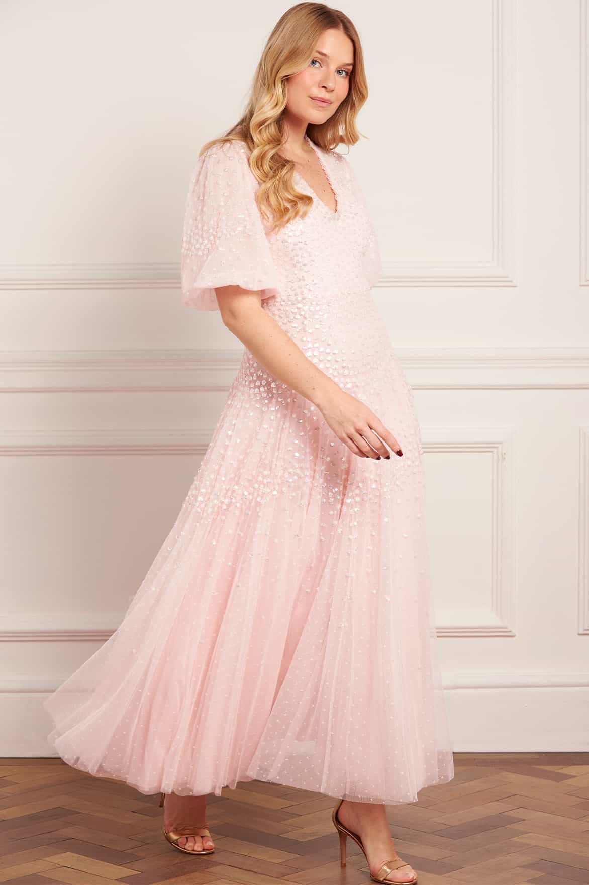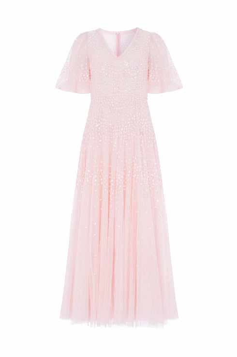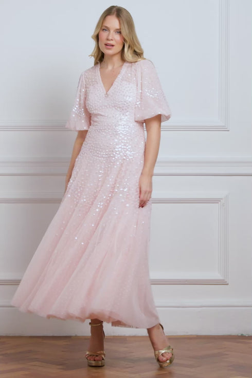 NEW SEASON. The Scallop Sequin V-Neck Ankle Gown in Seashell. Glistens with delicate sequin clusters inspired by art deco patterning. Its graceful cut and gentle flare create a timeless, romantic impression.