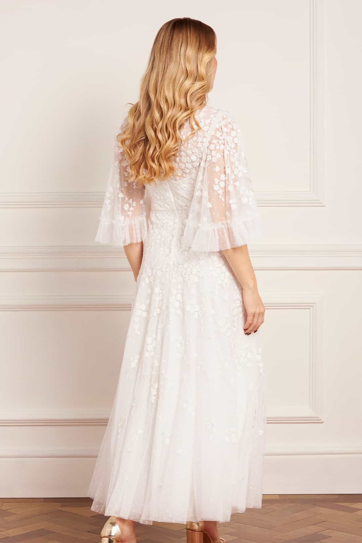NEW SEASON | NEEDLE & THREAD EXCLUSIVE. The Scatter Blossom Round Neck Ankle Gown in Swan White. Embodies refined purity. Crafted from tulle with delicate ditsy embroidery, this gown offers an ethereal interpretation of romantic evening wear.