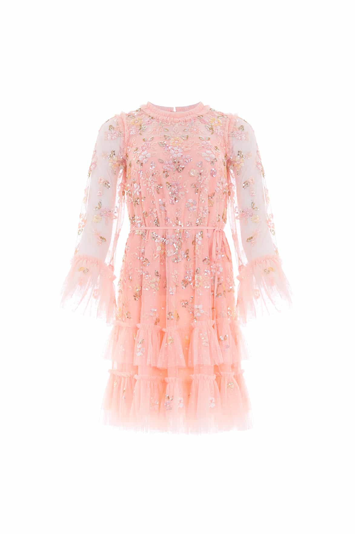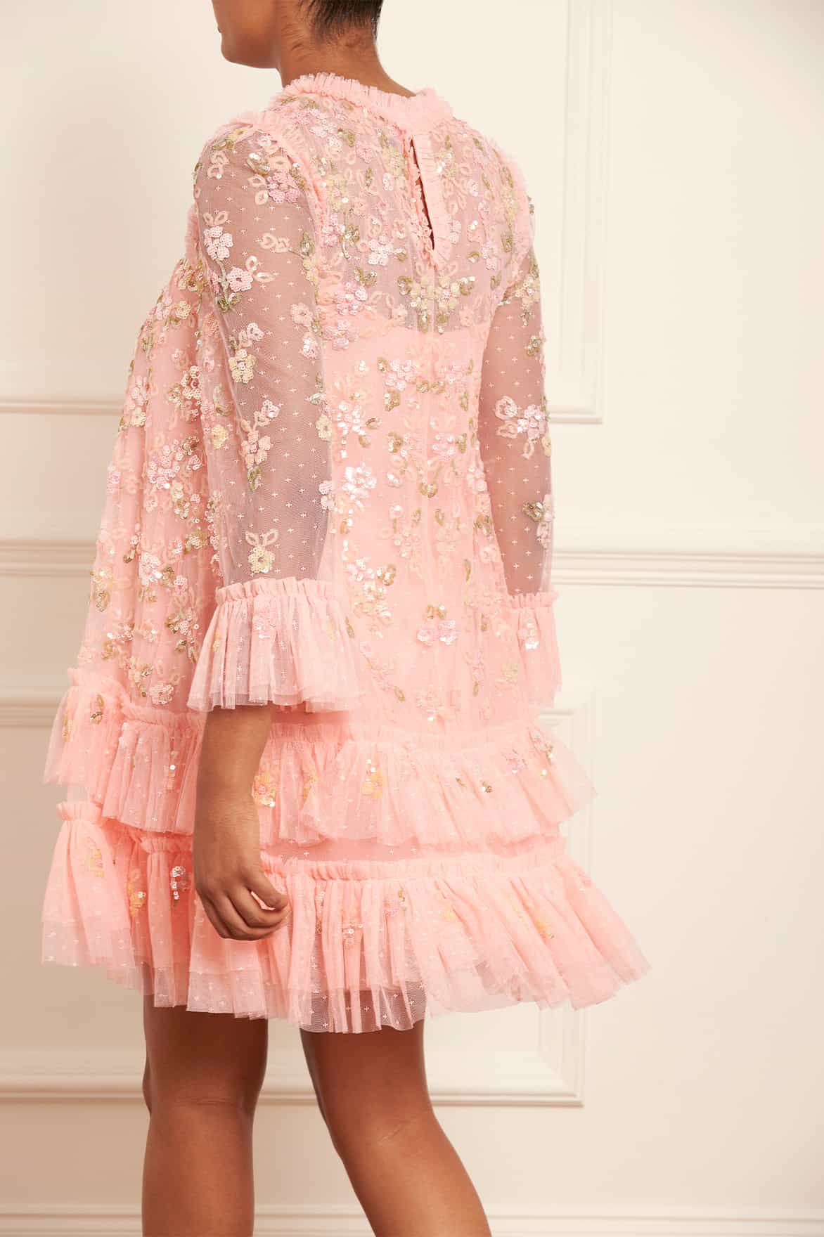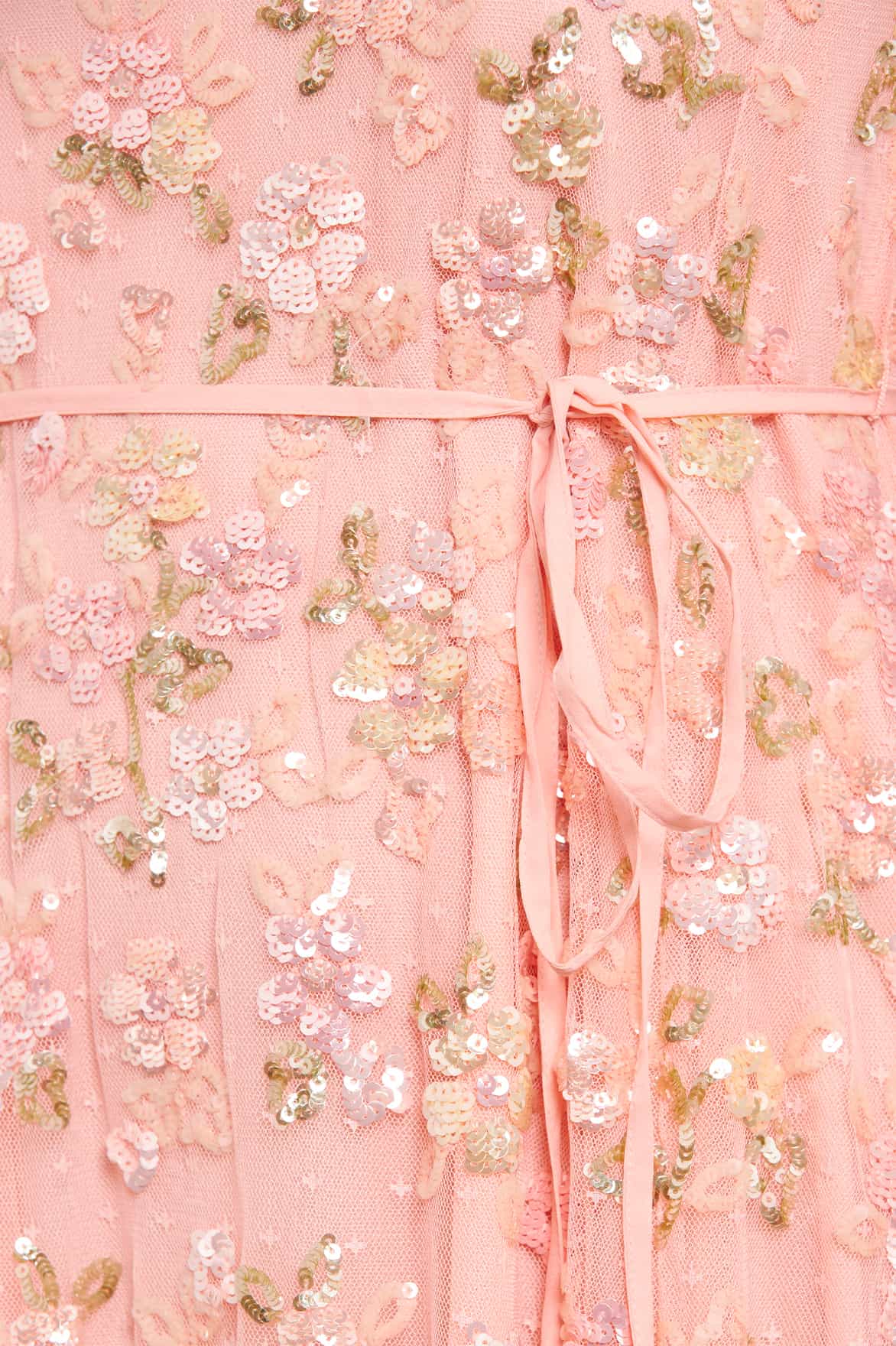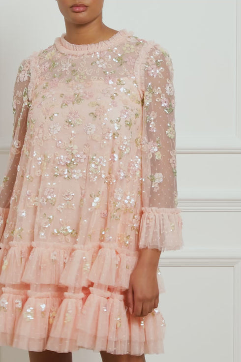The Sequin Bloom Gloss Mini Dress in Faded Coral. This mini dress is decorated with floral motifs that cascade down the dress in shimmering, sun-kissed tones of pink sequins. Designed with a flattering silhouette in a loose shape, creating a romantic, effortless style. This dress has a gathered panel at the hem and cuffs for signature Needle & Thread detailing. Make this dress your new wardrobe favourite.
