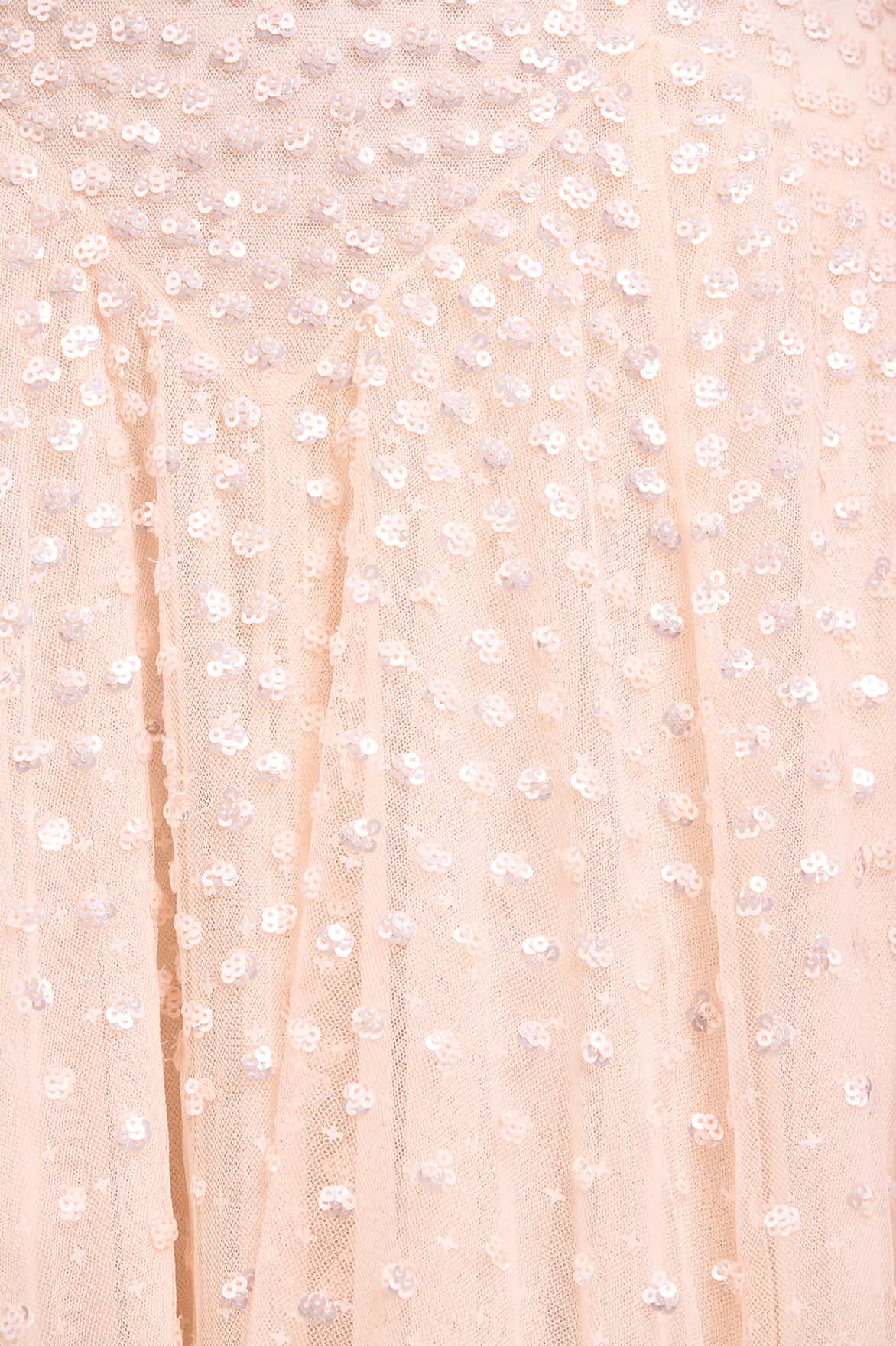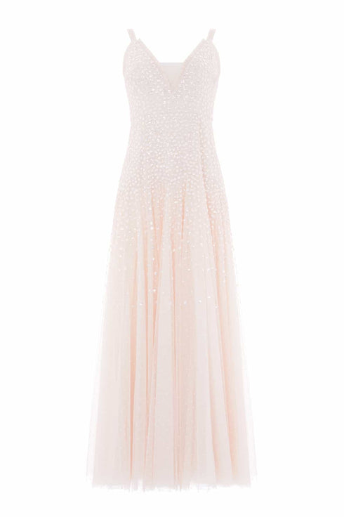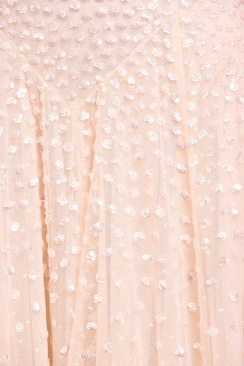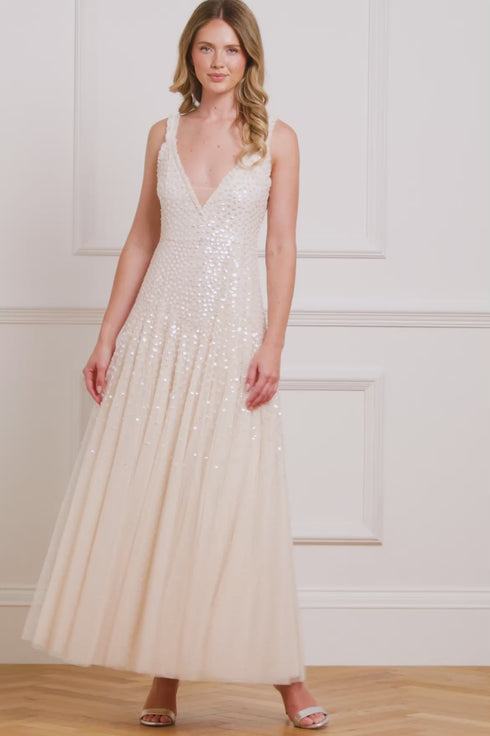 The Sequin Cascade Cami Plunge Gown in Opal/Cream. This beautiful dress features shimmering embellishment in contrast cream tones. The deep V neckline and layered tulle skirt create a flowing silhouette, while the sequins scatter across the surface for an iridescent effect. A captivating piece for unforgettable looks.