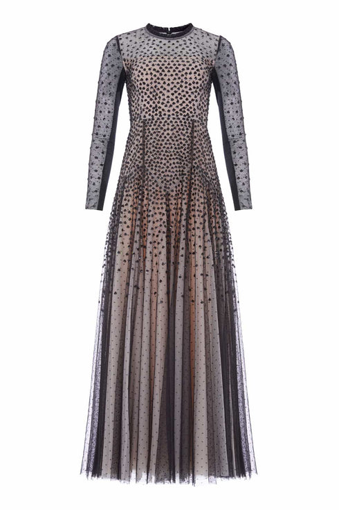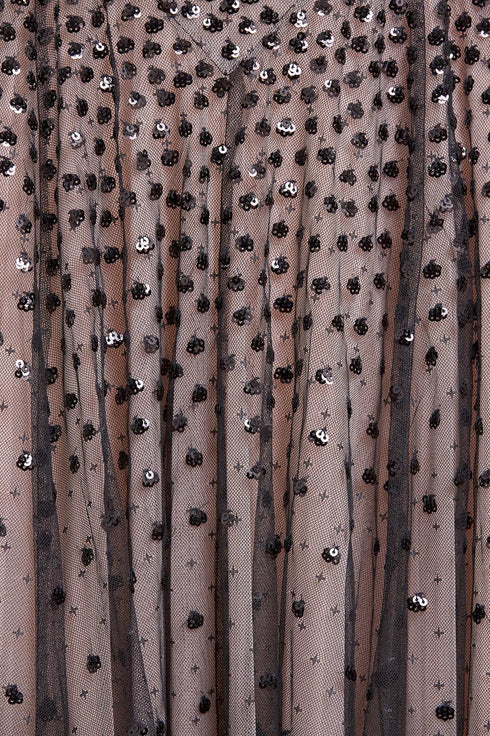 The Sequin Cascade Round Neck Gown in Graphite/Opal. Designed with contrast colour and light-catching sequin details. Soft signature kisses 'x' tulle is decorated with tonal embroidery and layered frills, with sequins artfully dispersed through the body and hem. A striking choice for truly unforgettable moments.