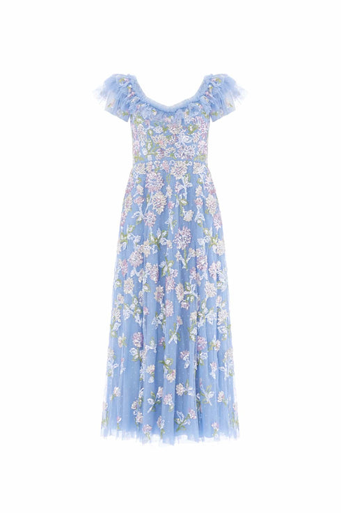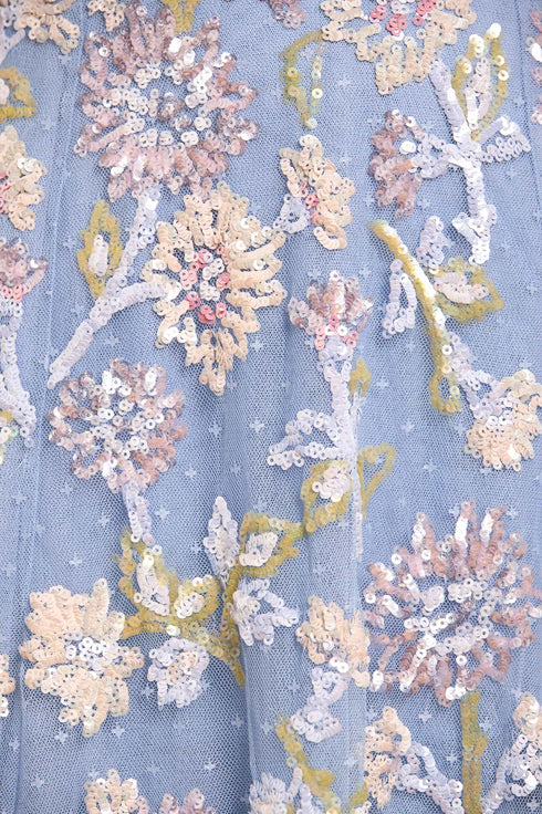 The Sequin Dandelion Ruffle Ballerina Dress in Sky Blue, inspired by Victorian botanical artist Marianne North. This dress features colourful shimmering dandelion floral sequins that scatter towards the hem. The high-shine sequins, coated with foil, add a lustrous finish. The flattering skirt skims the body, gently flaring for beautiful movement. Crafted with frothy tulle frill sleeves and signature Needle & Thread frills at the neckline enhance its romantic, elegant feel.