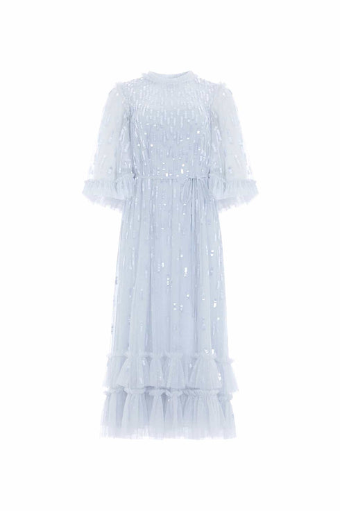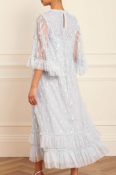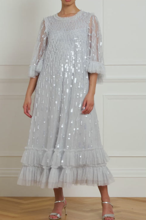 The Sequin Dash Ballerina Dress in Cloud. This ballerina length dress is adorned with statement, square sequins in a staggered linear layout creating a shimmer throughout. Developed with a loose silhouette for an effortless, floaty feel featuring voluminous sleeves for a romantic look. The perfect dress for an upcoming special occasion.