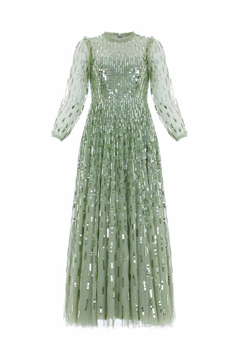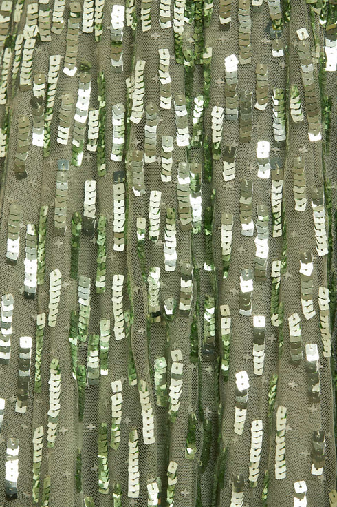 The Sequin Dash Long Sleeve Gown in Olive. This ankle length gown is adorned with statement, square sequins in a staggered linear layout creating a shimmer throughout. Developed with a loose silhouette for an effortless, floaty feel featuring long sheer-sleeves for a romantic look. The perfect gown for an upcoming special occasion.