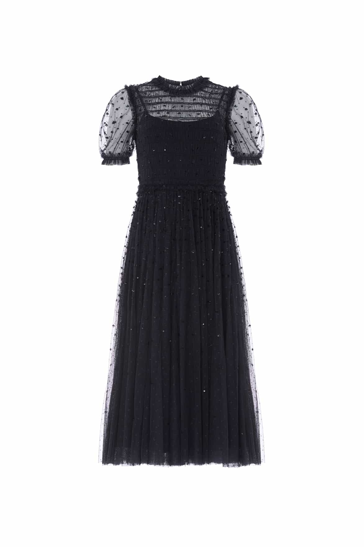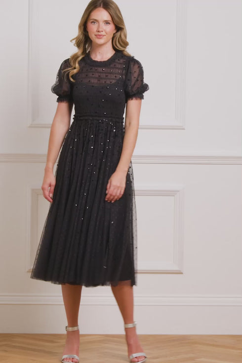 The Sequin Giselle Smocked Ballerina Dress in Graphite. A ballet-inspired style crafted from signature kisses 'x' tulle and embellished with scattered sequins. The smocked waist offers gentle structure, while the ballerina-length skirt adds soft movement. A whimsical yet polished silhouette for formal occasions.