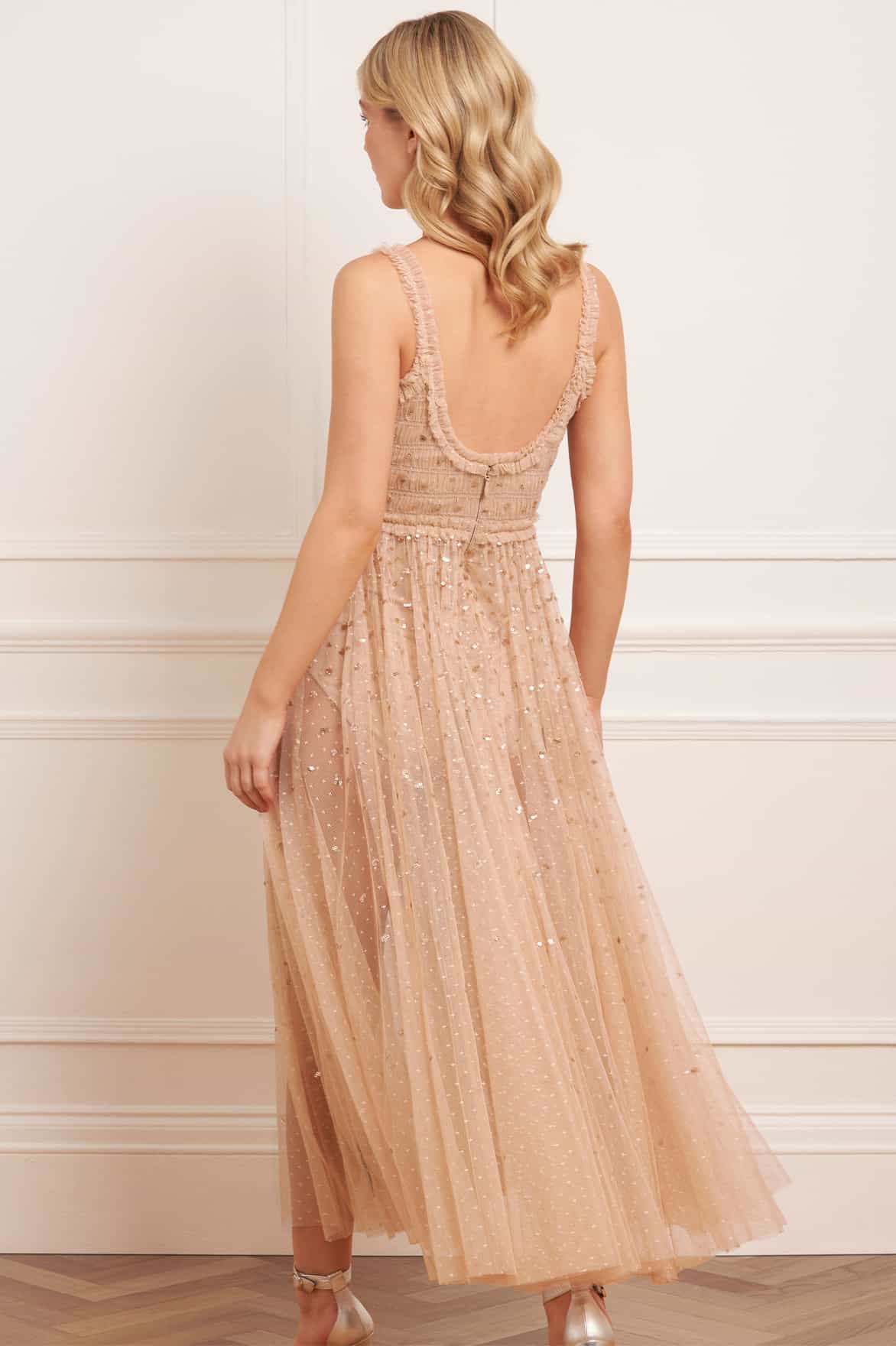 The Sequin Giselle Smocked Cami Ankle Gown in Butterscotch. This refined party gown features a scoop neckline, slim camisole straps, and a shirred bodice for a flattering fit. Signature Needle & Thread frills adorn the neckline and waist, while glittering sequin dot motifs cascade down the sheer, floaty skirt. Finished with an integrated power mesh bodysuit for comfort and support, this piece is a graceful blend of romance and sparkle—perfect for special occasions.